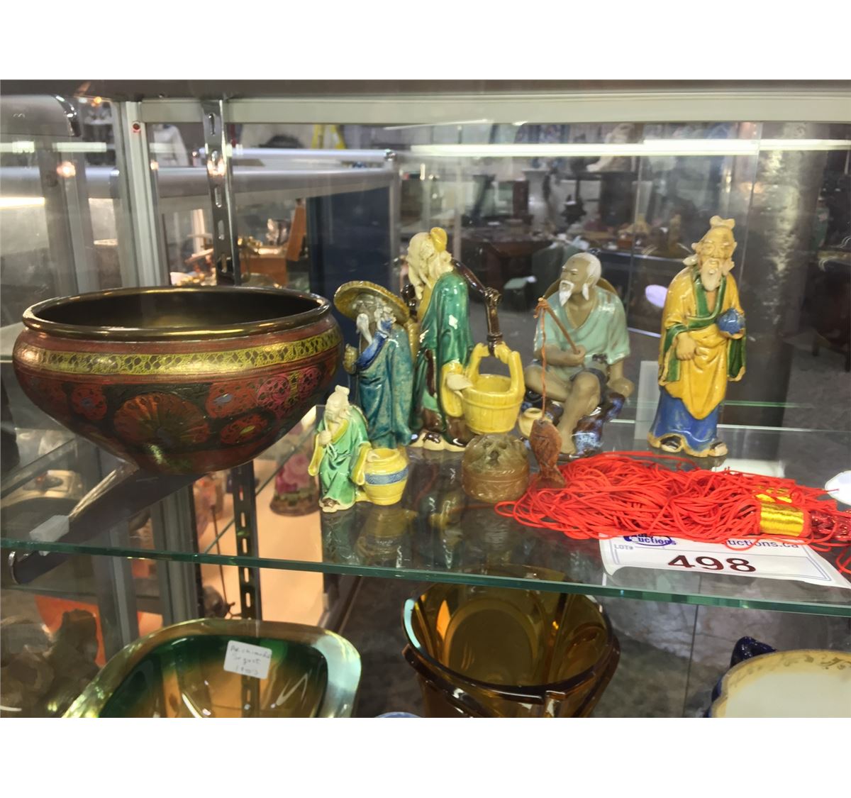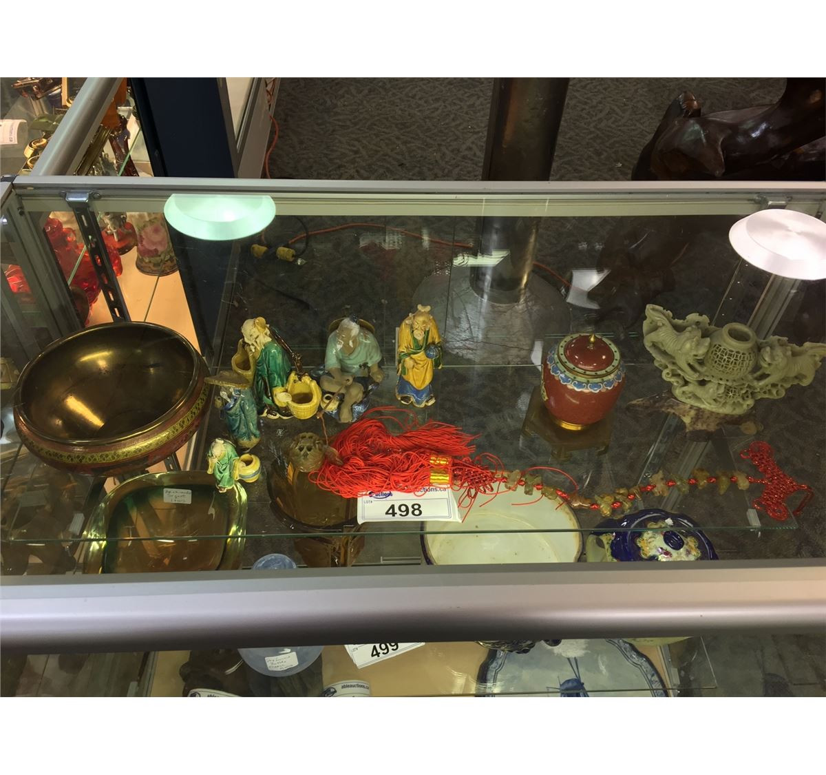 SHELF LOT OF COLLECTABLES: CLOISONNE, SOAPSTONE, MUDMEN, ETC.