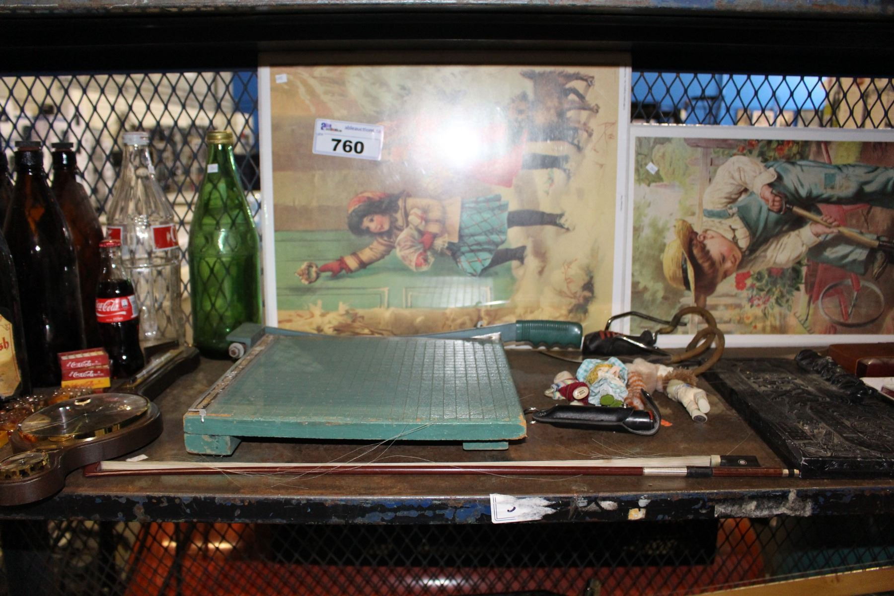 SHELF LOT OF COLLECTABLES INCLUDING OLD BOTTLES, ARTWORK, PAPER CUTTER AND MORE