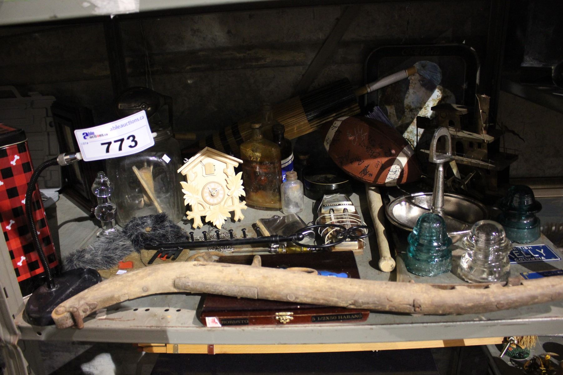 SHELF LOT OF COLLECTABLES INCLUDING SIGNED FOOTBALL, MOCCASINS, ANTIQUE LIGHT COVERS, VINTAGE TRAY AND MORE
