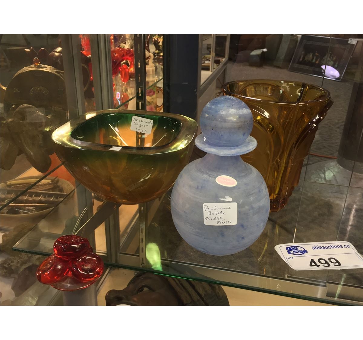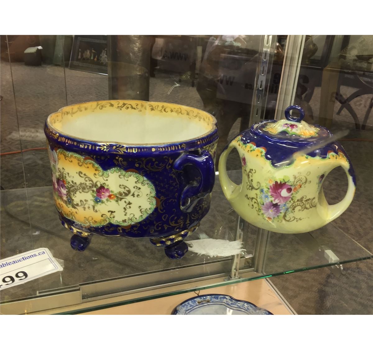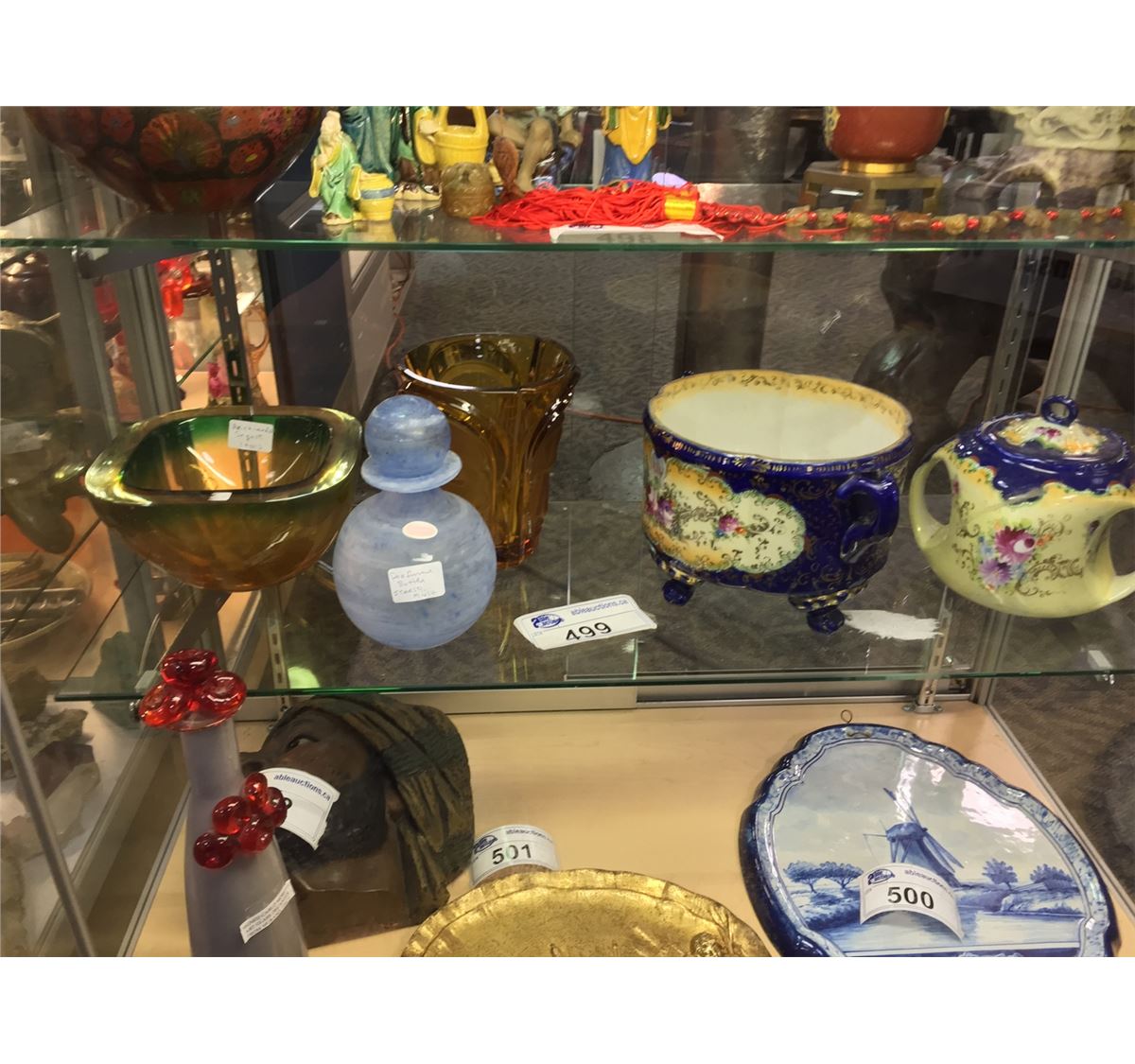 SHELF LOT OF COLLECTABLES: PORCELAIN VICTORIAN PLANTER, ART GLASS ETC.