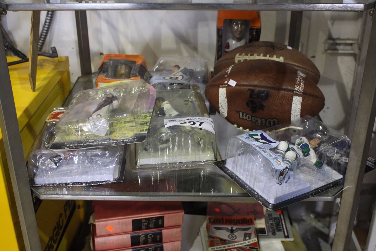 SHELF LOT OF COLLECTIBLE ITEMS INCLUDING FOOTBALLS