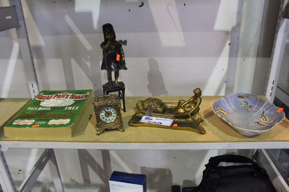 SHELF LOT OF COLLECTIBLES INCLUDING VINTAGE CLOCK, BRONZE FIGURE, BRASS INKWELL SET, COLLECTORS PLATE & SEARS CATALOGUE
