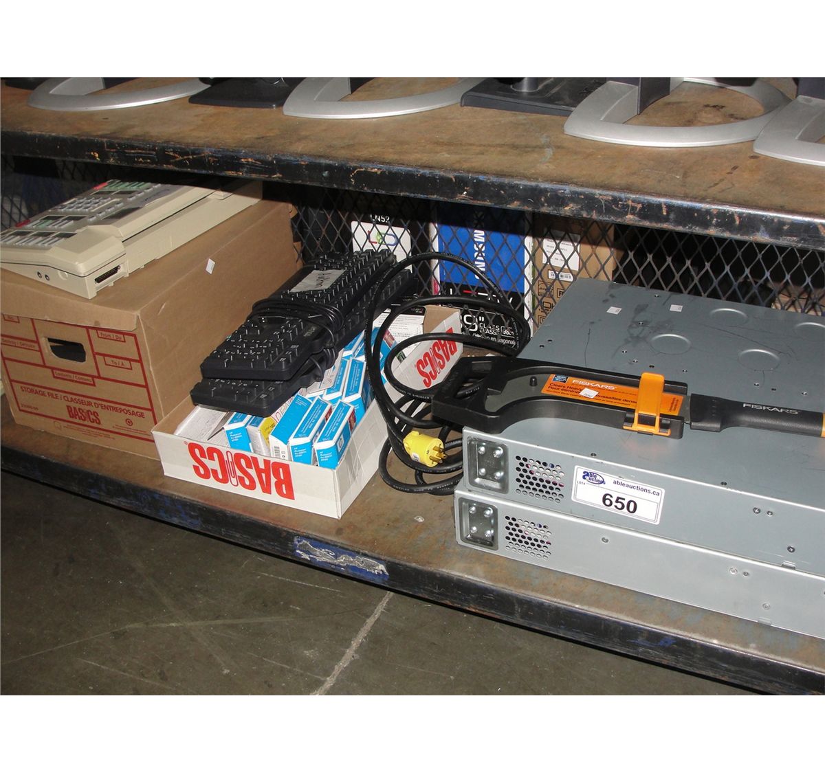 SHELF LOT OF COMPUTER ITEMS, PHONES AND A FISKARS 23CM BRUSH AXE