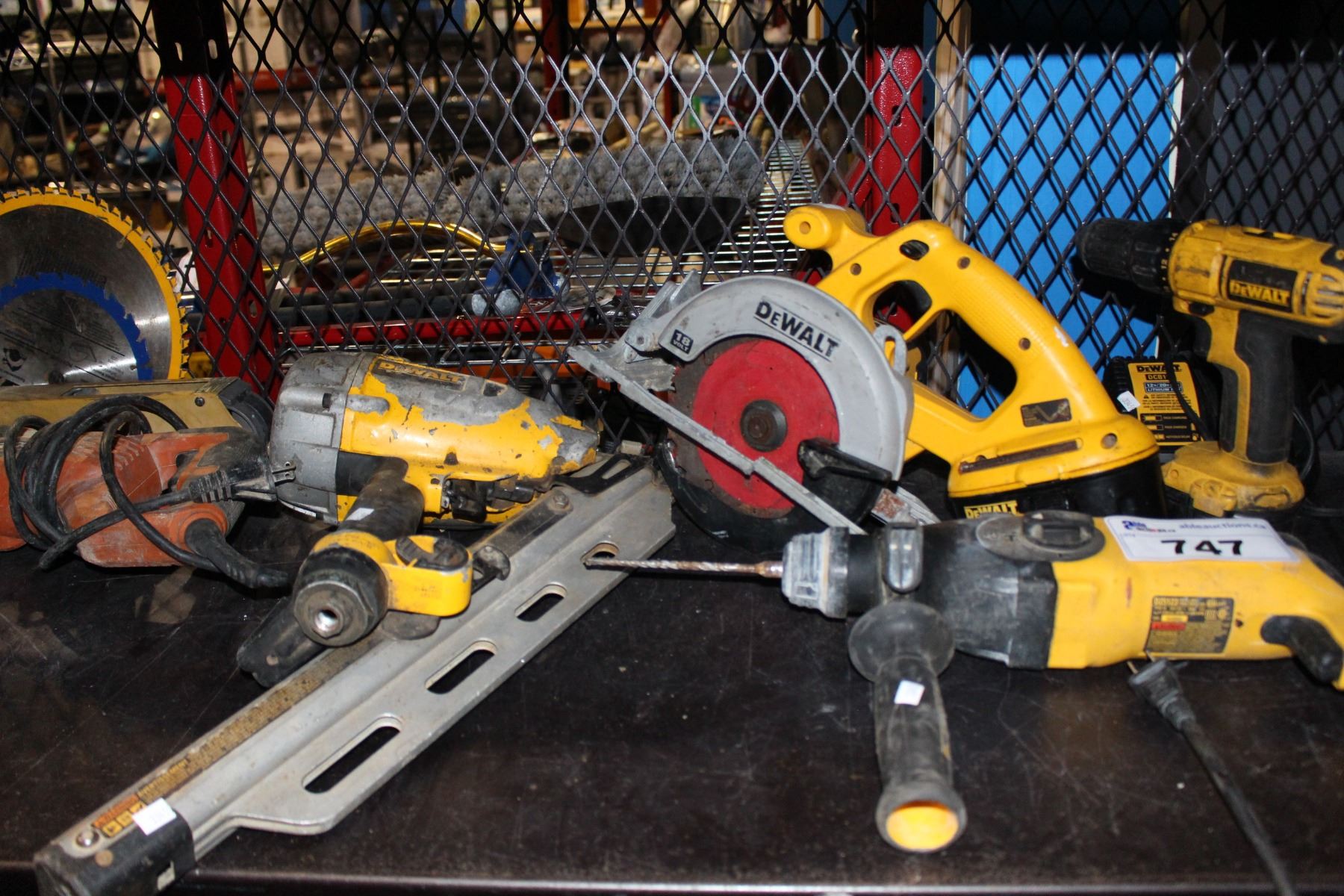SHELF LOT OF CONSTRUCTION GOODS AND TOOLS INCLUDING DEWALT DRILLS, SAWS AND MORE