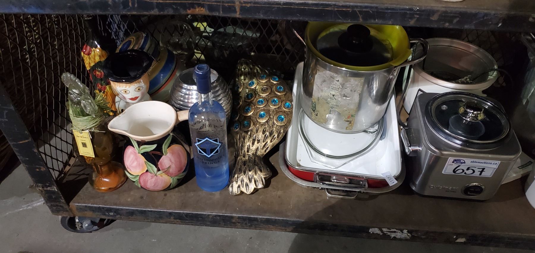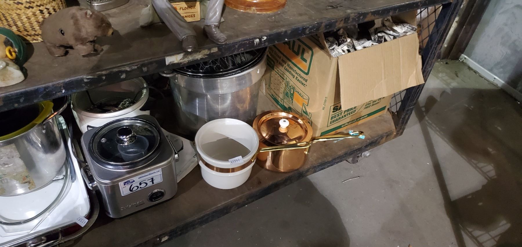 SHELF LOT OF COOKING WARE, GLASSWARE, COPPER POT, AND MORE