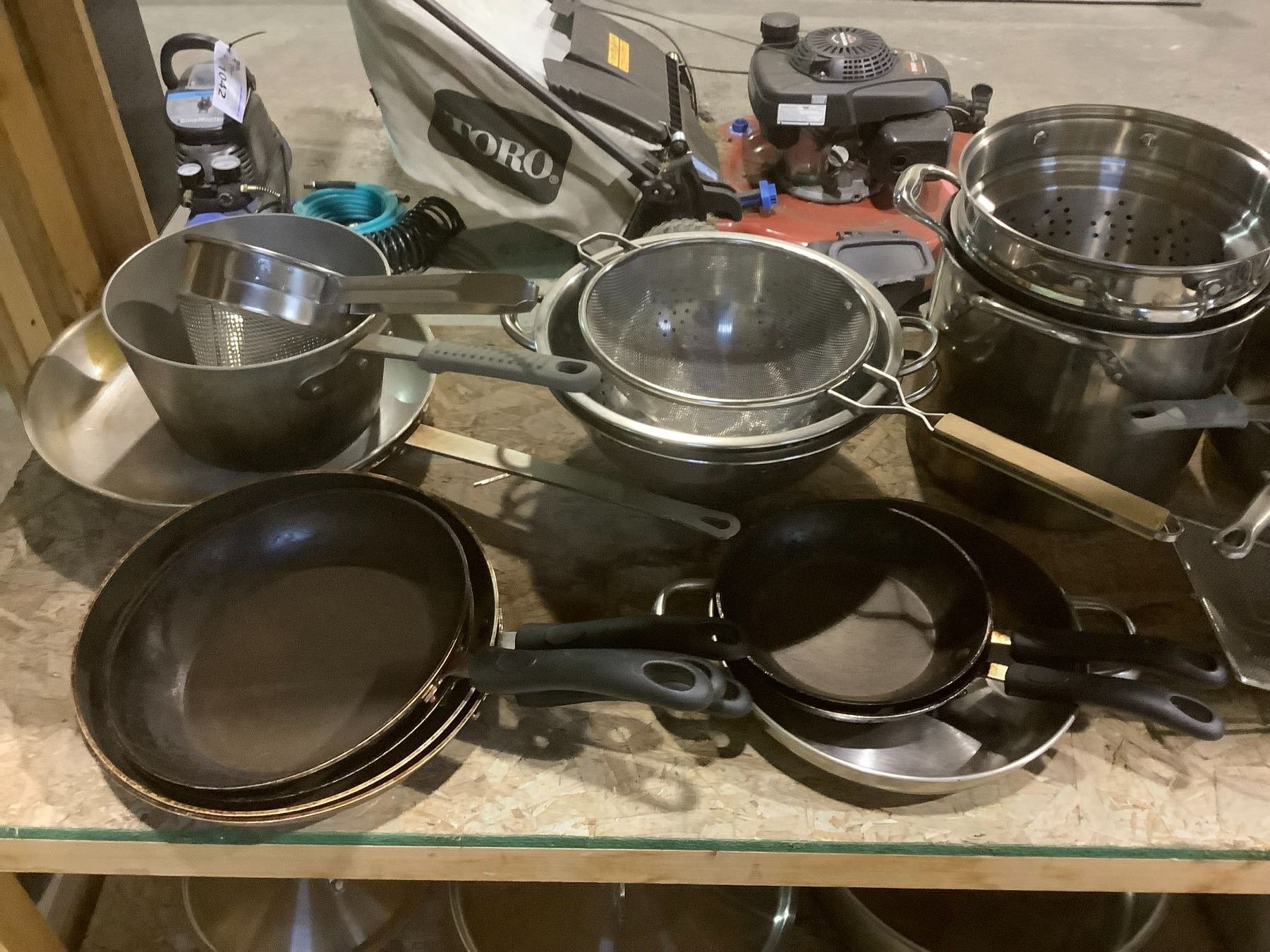 SHELF LOT OF COOKWARE, SKIMMERS, SIFTERS, WHISK'S, AND MORE
