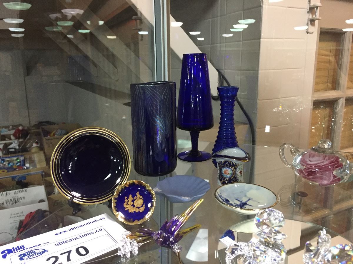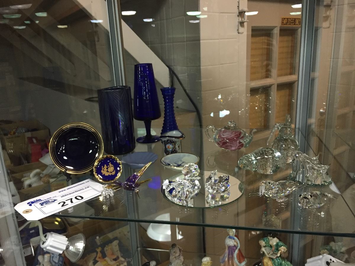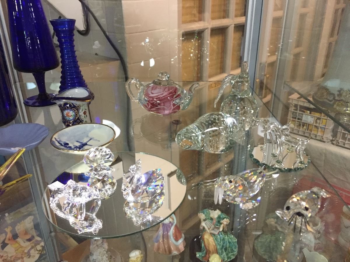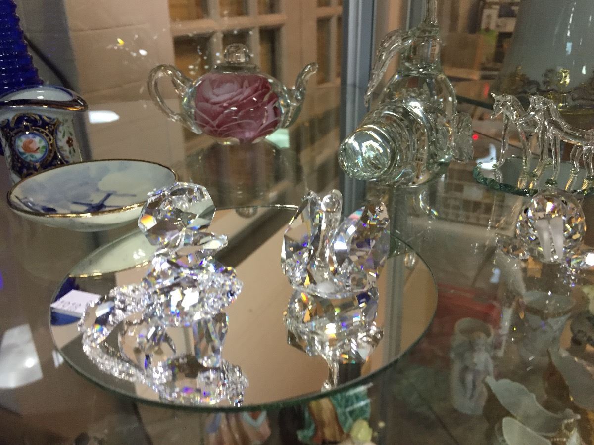 SHELF LOT OF CRYSTAL AND GLASS COLLECTABLES, INCL. SWAROVSKI