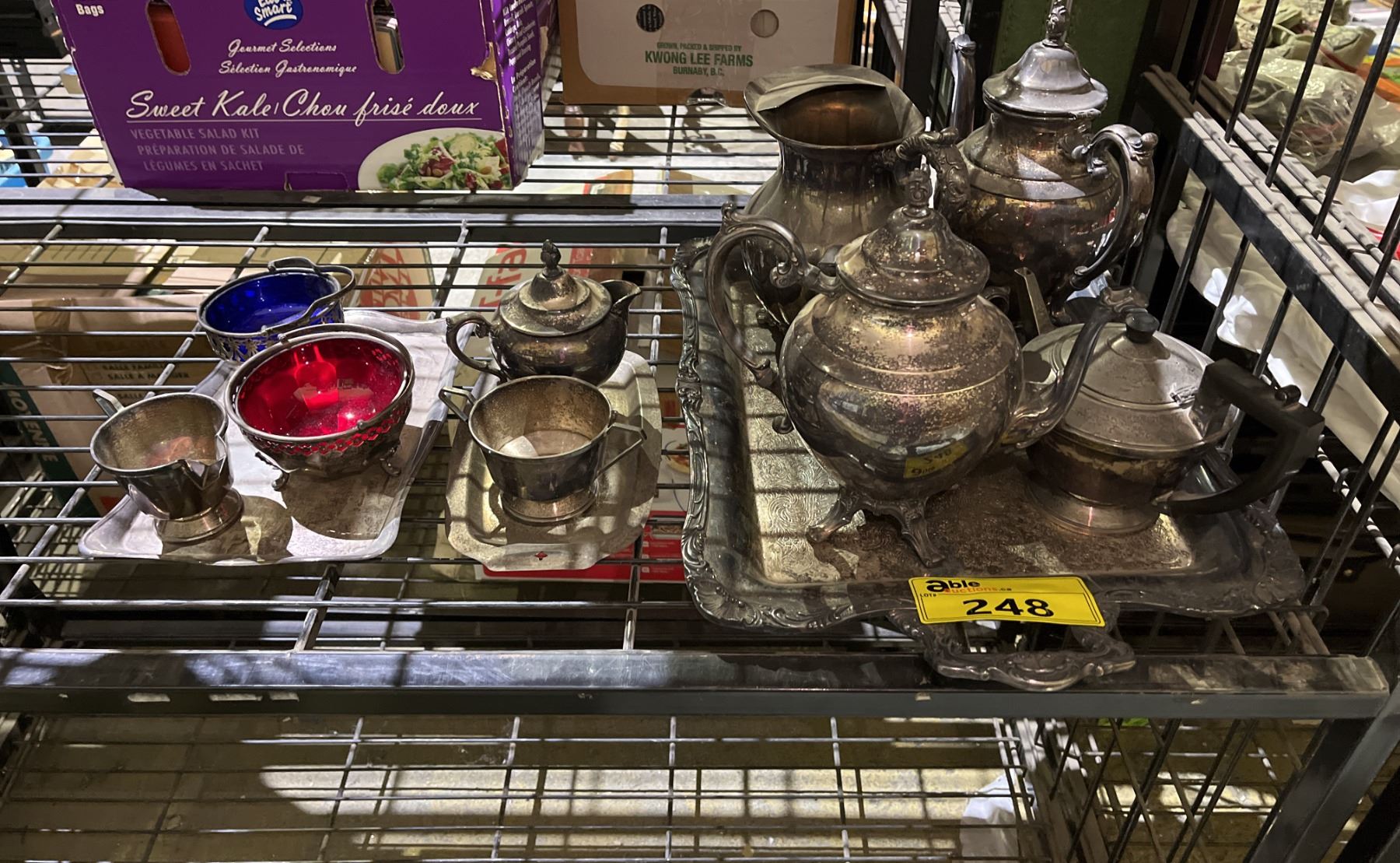 SHELF LOT OF CUPS, TEA POTS AND MORE