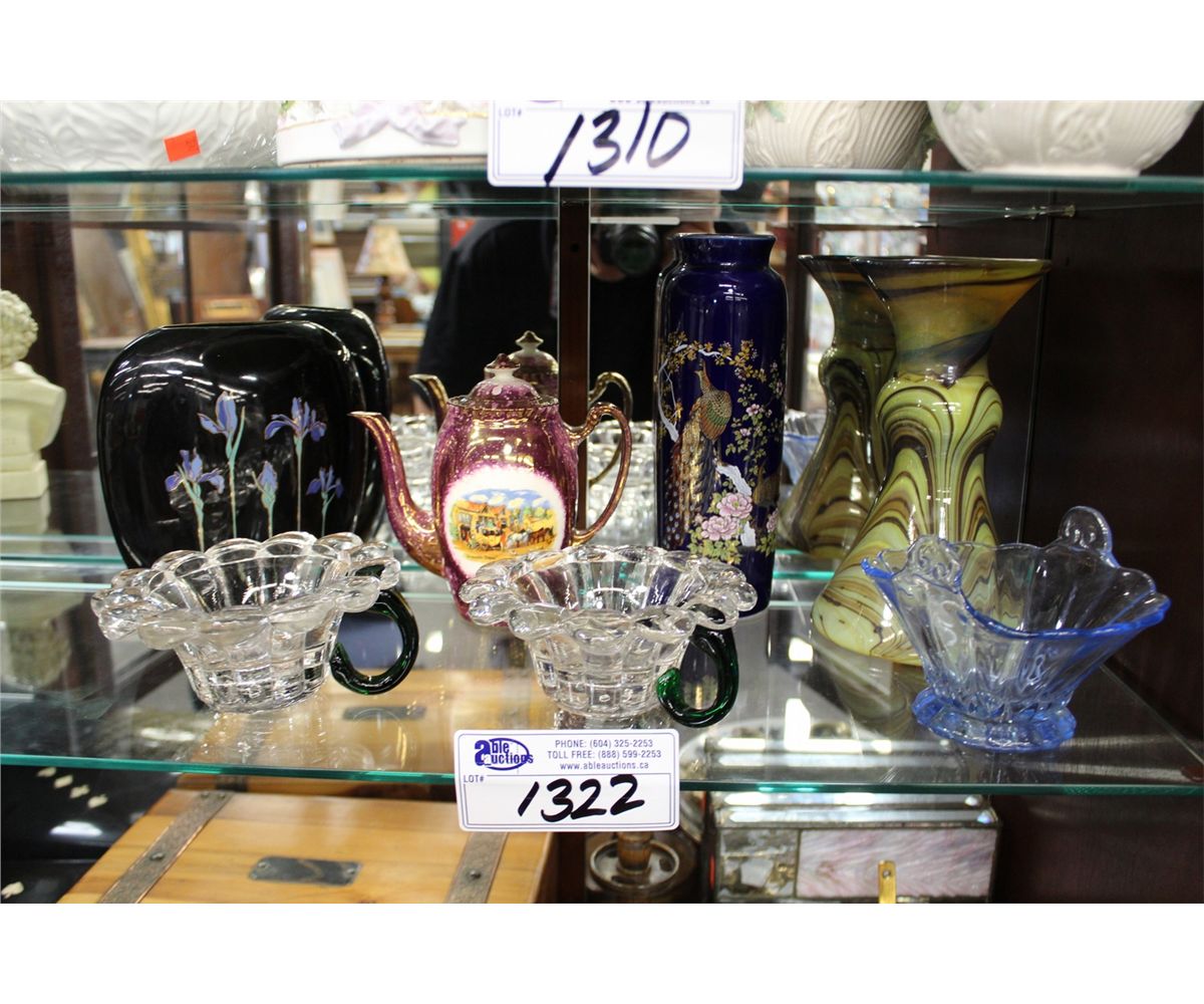 SHELF LOT OF DECORATIVE GLASS AND POTTERY