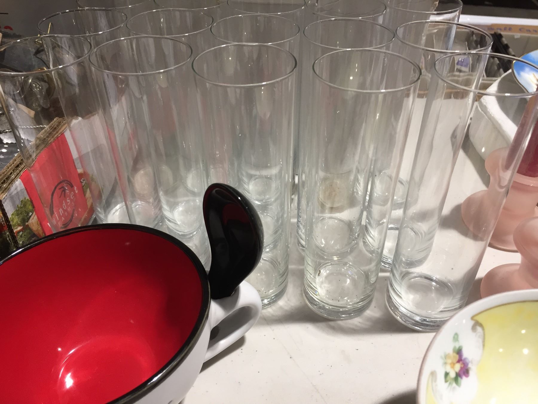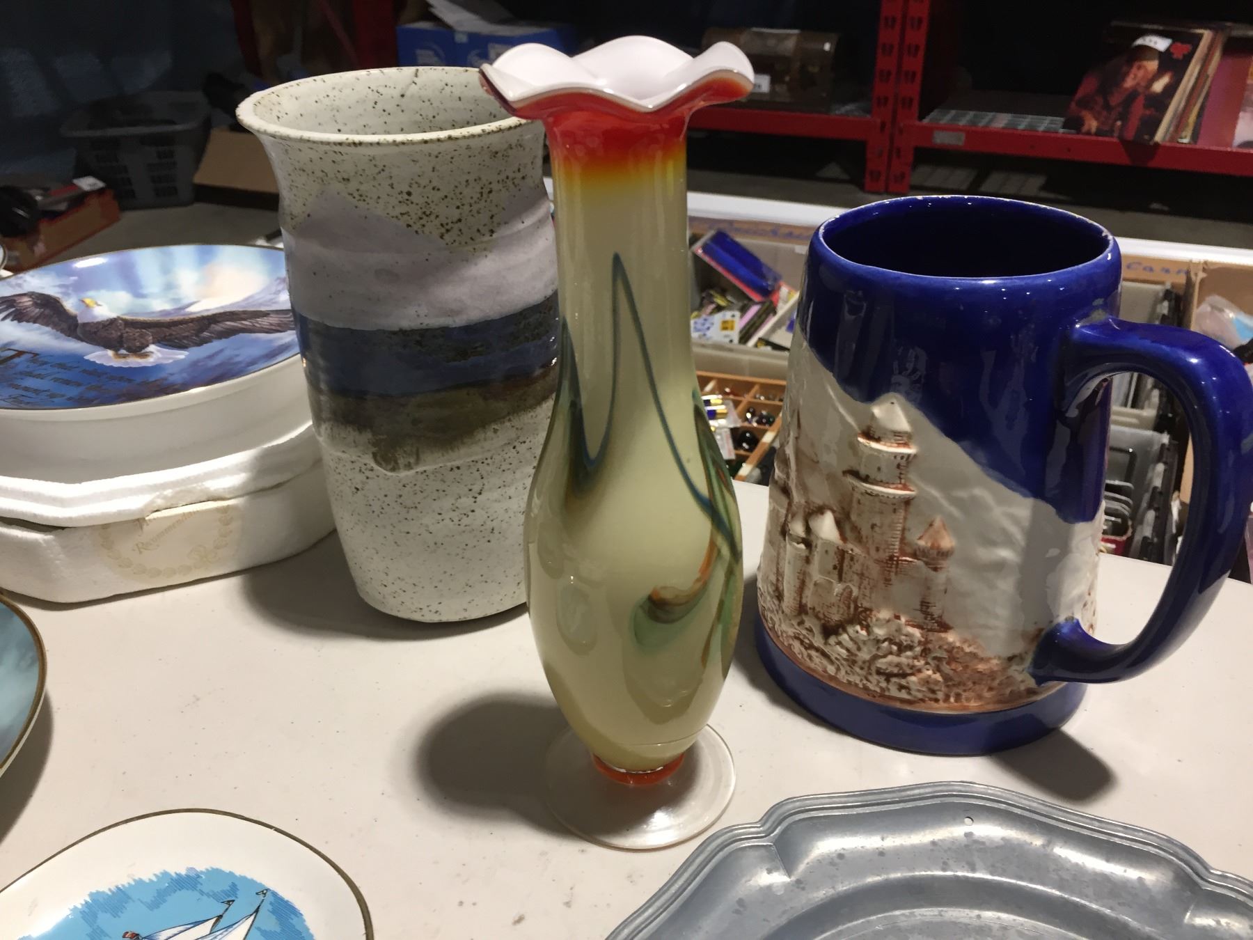 SHELF LOT OF DECORATIVE PLATES/STEINS/VASES/CHINA CANDLE HOLDERS/GLASSES & ASSTD SILVERWARE