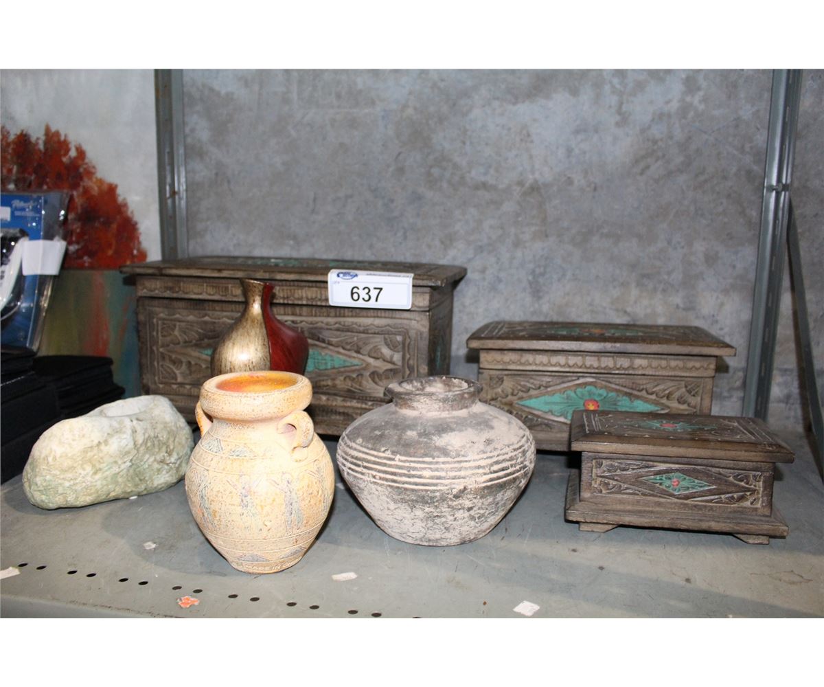 SHELF LOT OF DECORATIVE WOODEN BOXES AND VASES