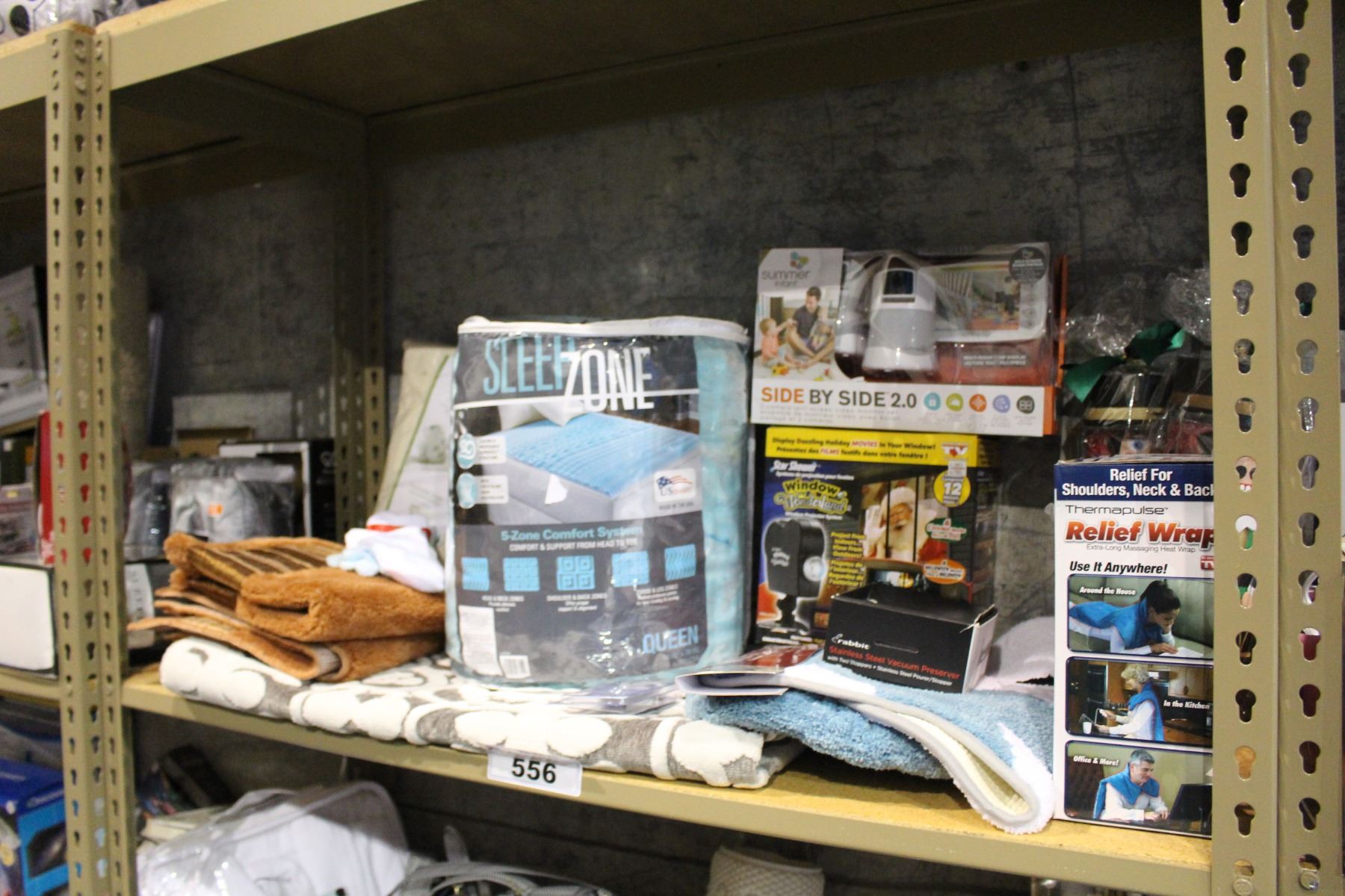 SHELF LOT OF DEPARTMENT STORE GOODS: BABY MONITOR, MATTRESS TOPPER, BATH MATS AND MORE