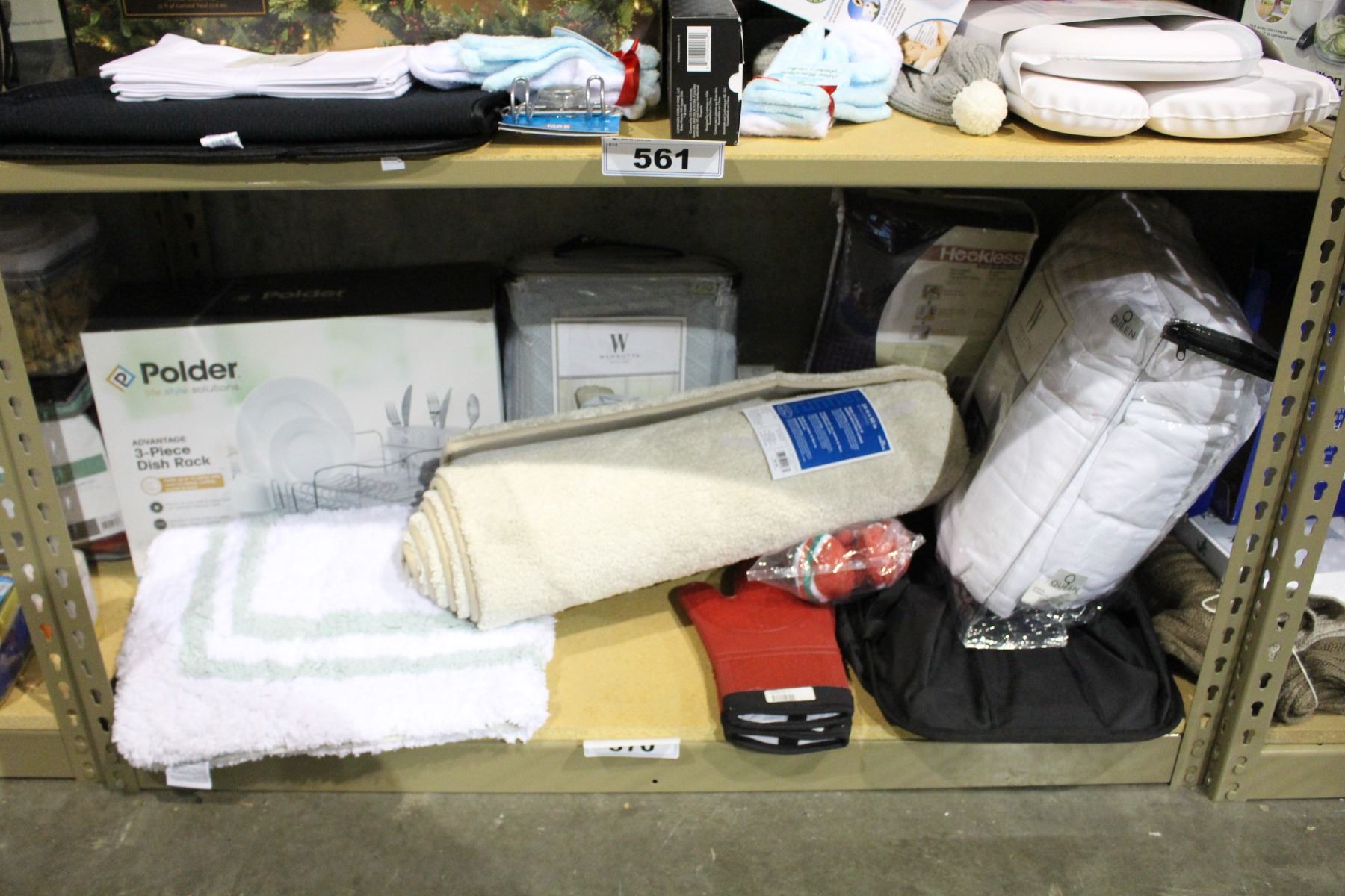 SHELF LOT OF DEPARTMENT STORE GOODS: DISH RACK, BATH MATS, MATTRESS PAD AND MORE