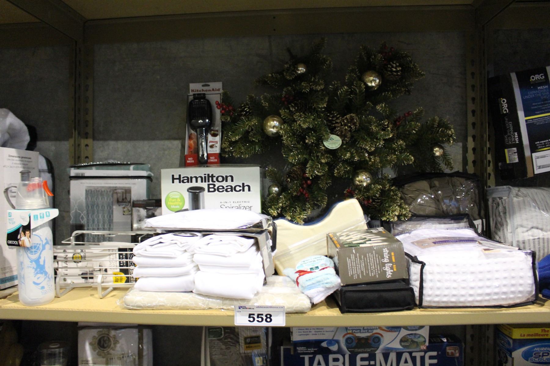 SHELF LOT OF DEPARTMENT STORE GOODS: MEMORY FOAM PILLOW, SHOWER CURTAINS, CHRISTMAS DECORATIONS AND MORE