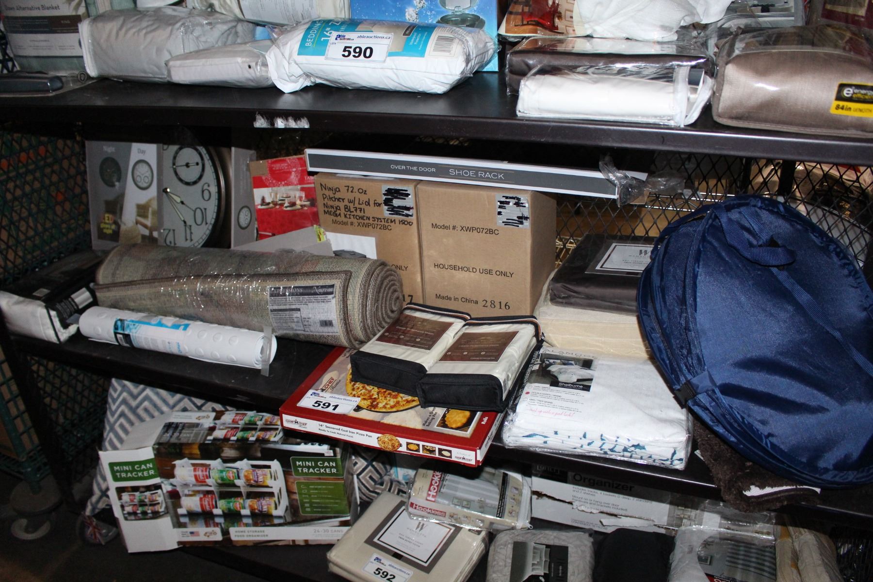 SHELF LOT OF DEPARTMENT STORE GOODS: OVER THE DOOR ORGANIZER, CLOCK, CAST IRON PAN AND MORE