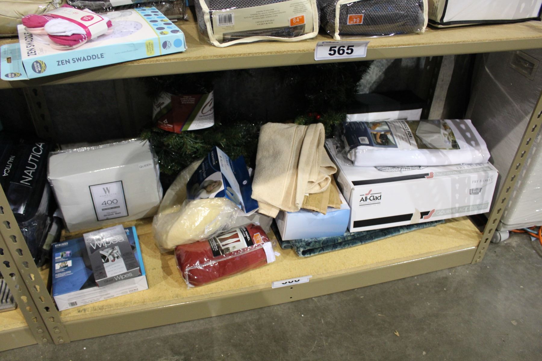SHELF LOT OF DEPARTMENT STORE GOODS: SHEET SET, FRYER BASKET, TOWELS AND MORE
