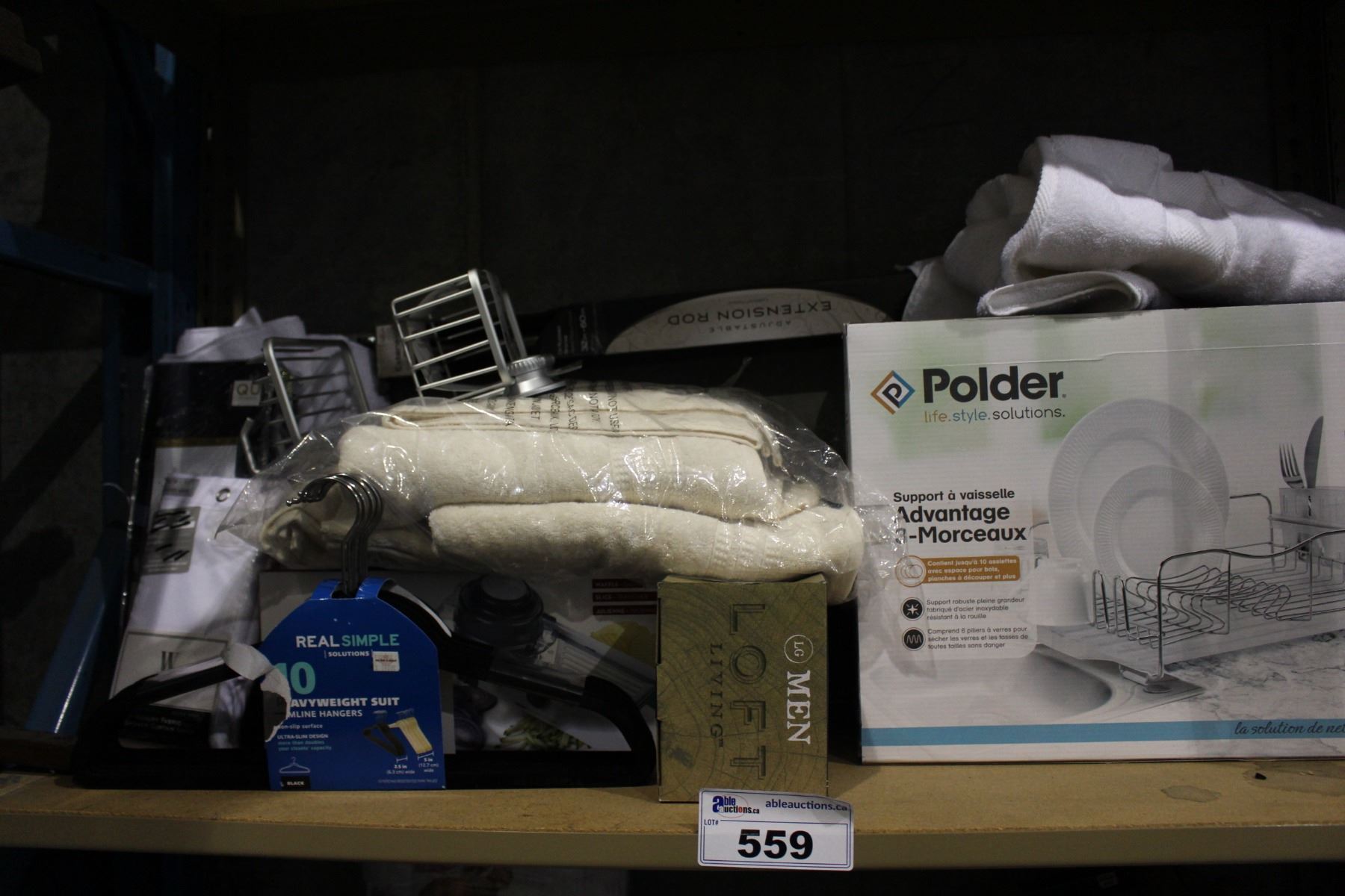 SHELF LOT OF DEPARTMENT STORE GOODS: TOWELS, EXTENSION ROD, SHOWER ORGANIZER AND MORE