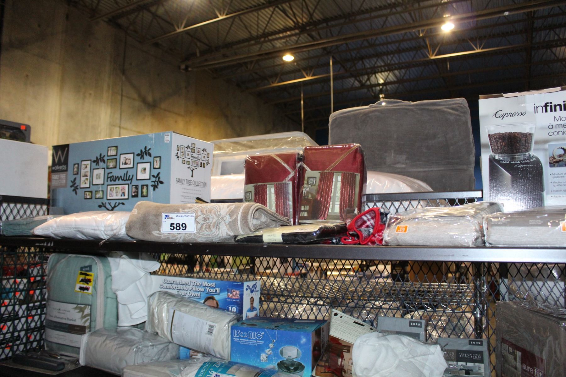 SHELF LOT OF DEPARTMENT STORE GOODS: WALL DECOR, COFFEE GRINDER, CURTAINS AND MORE
