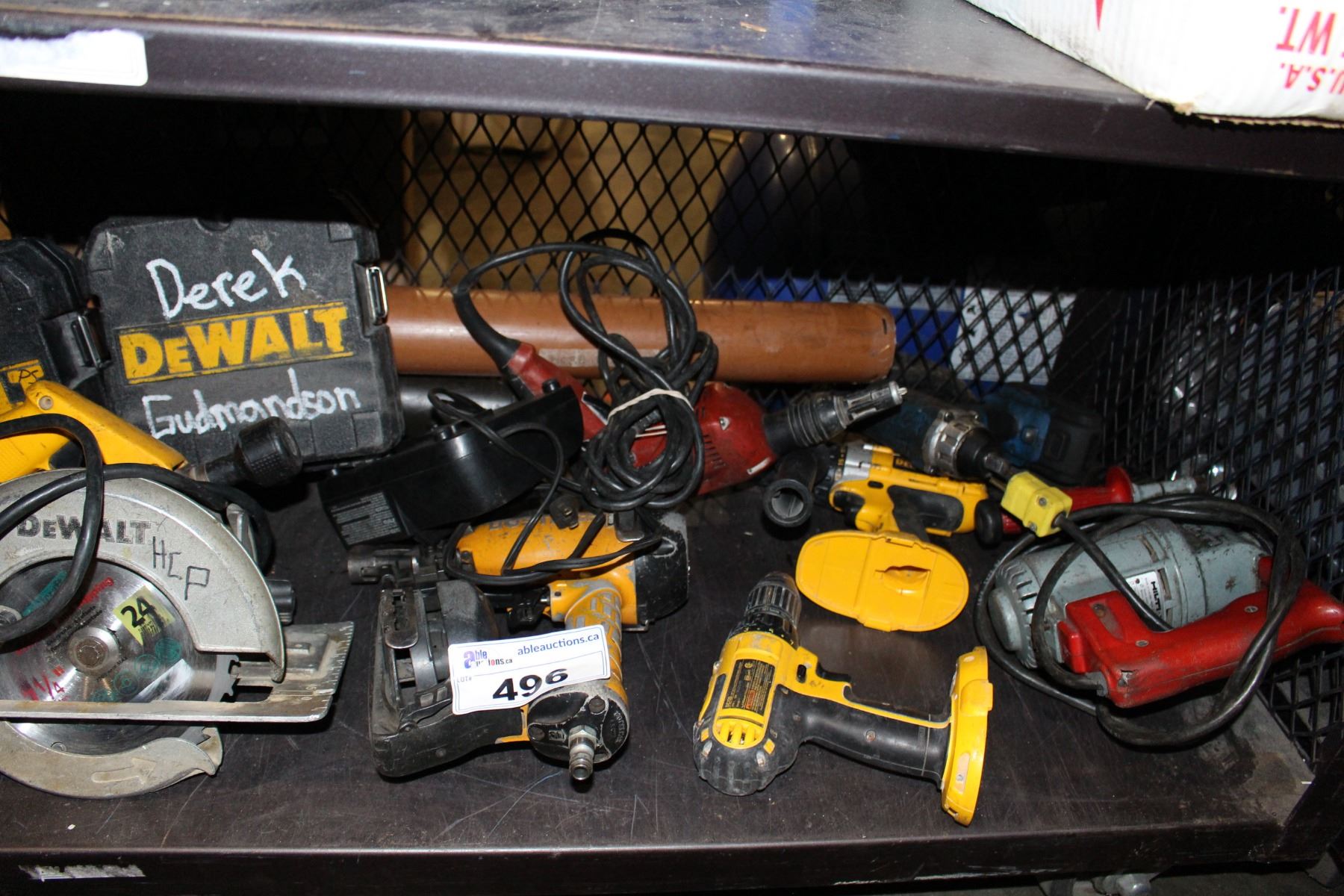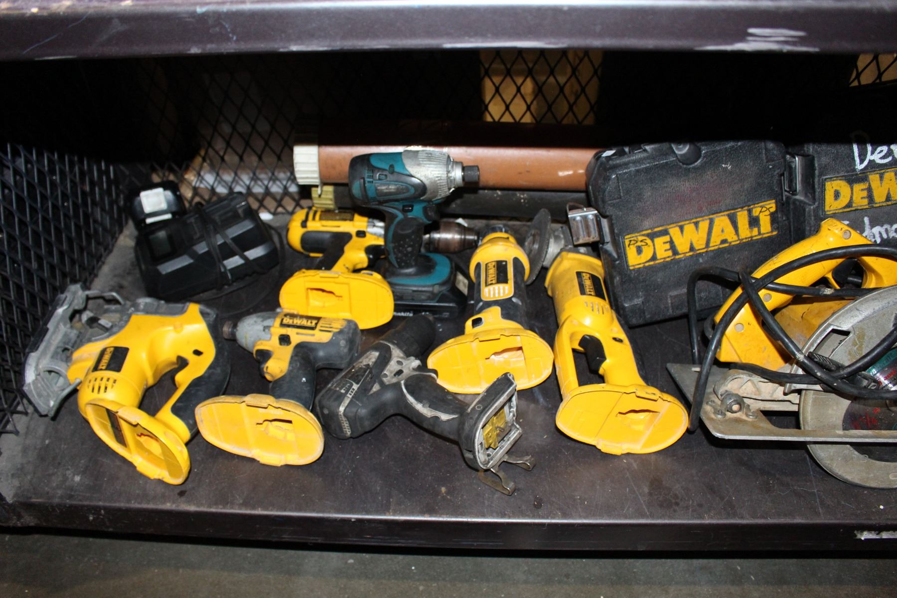 SHELF LOT OF DEWALT TOOLS - CORDLESS AND CORDED