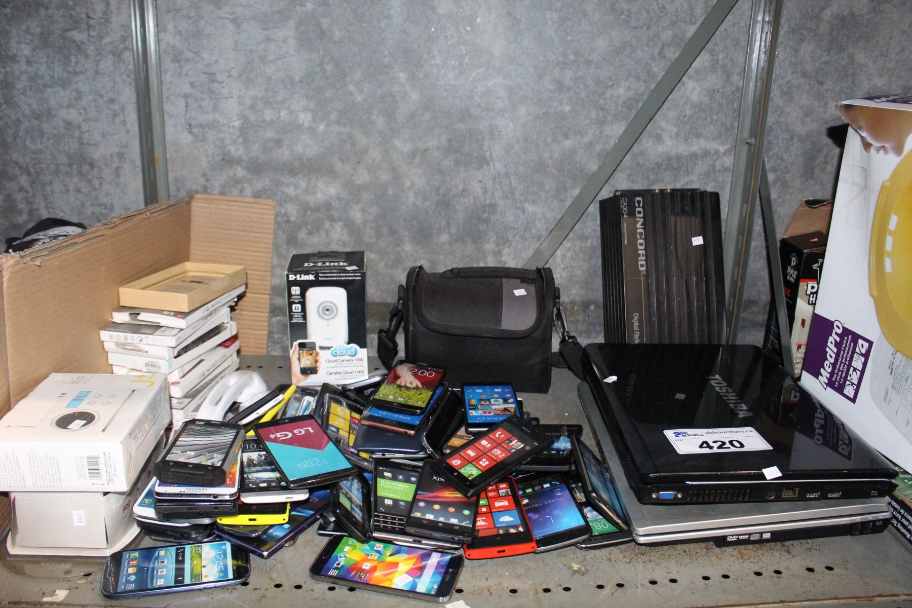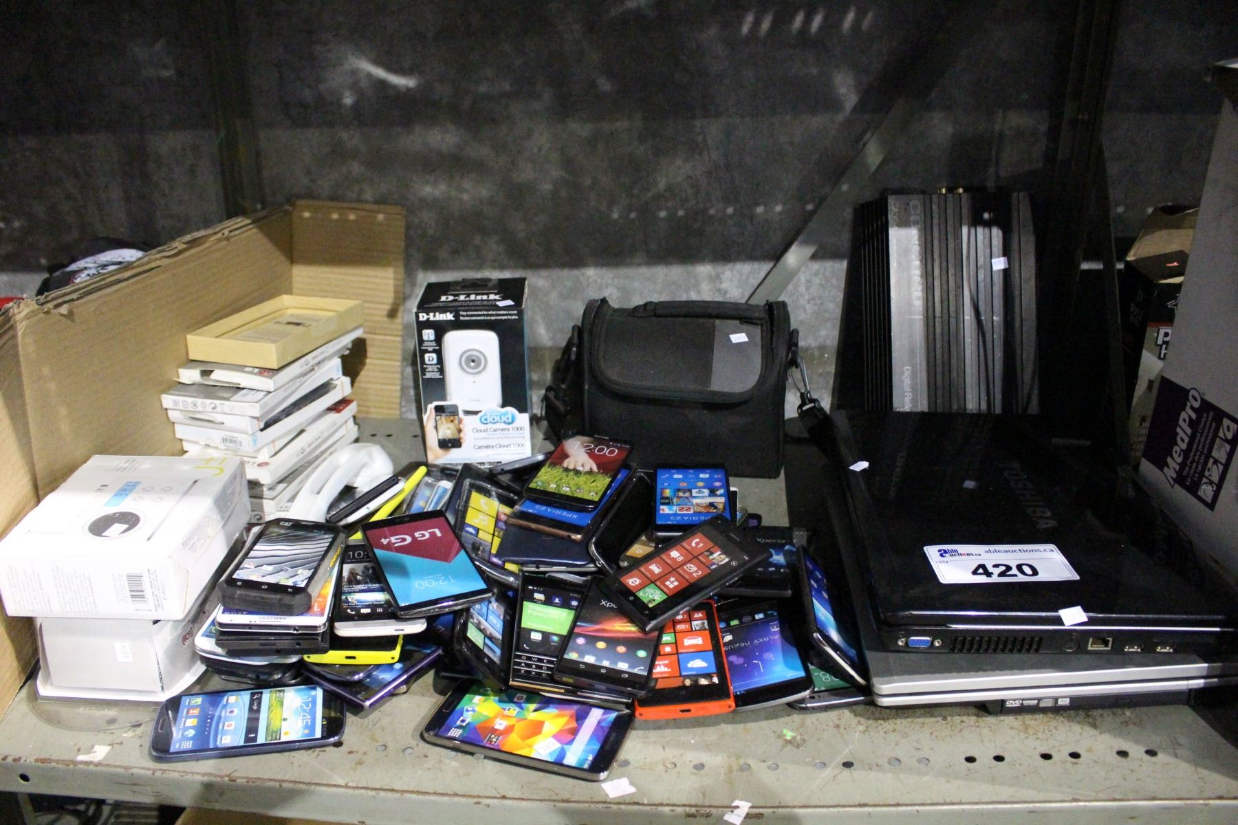 SHELF LOT OF DISPLAY CELL PHONES (NOT WORKING) AND LAPTOP