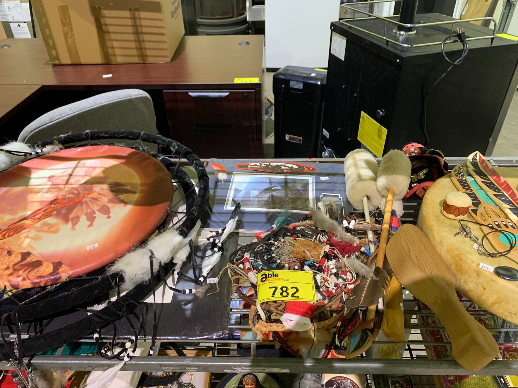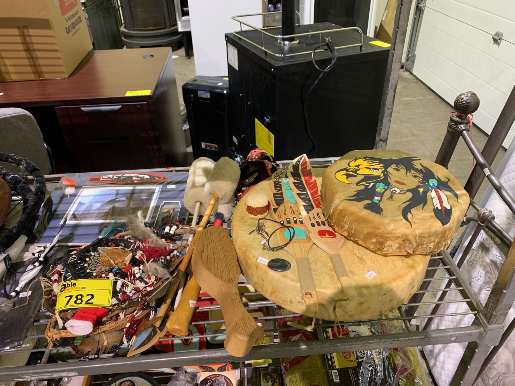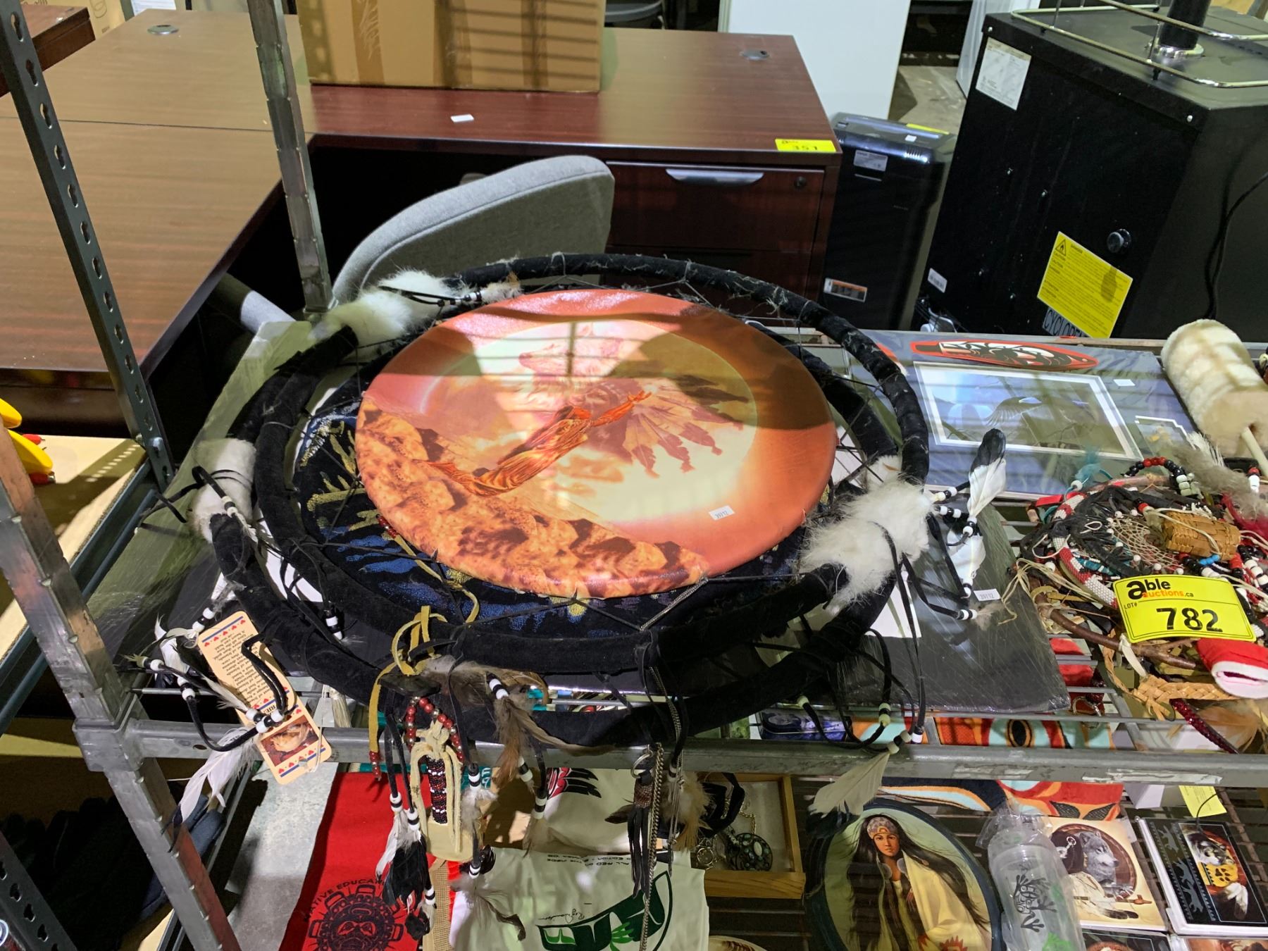 SHELF LOT OF DREAM CATCHERS, DRUMS AND MORE