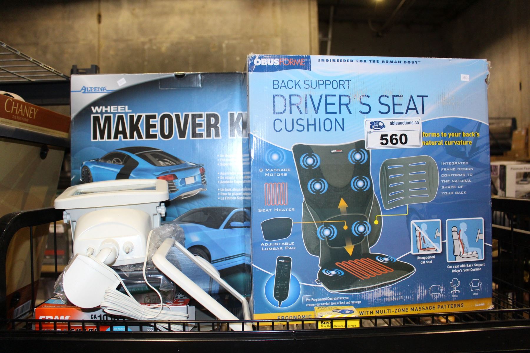 SHELF LOT OF DRIVERS SEAT MASSAGE CUSHION, WHEEL CLEANING KIT AND MORE
