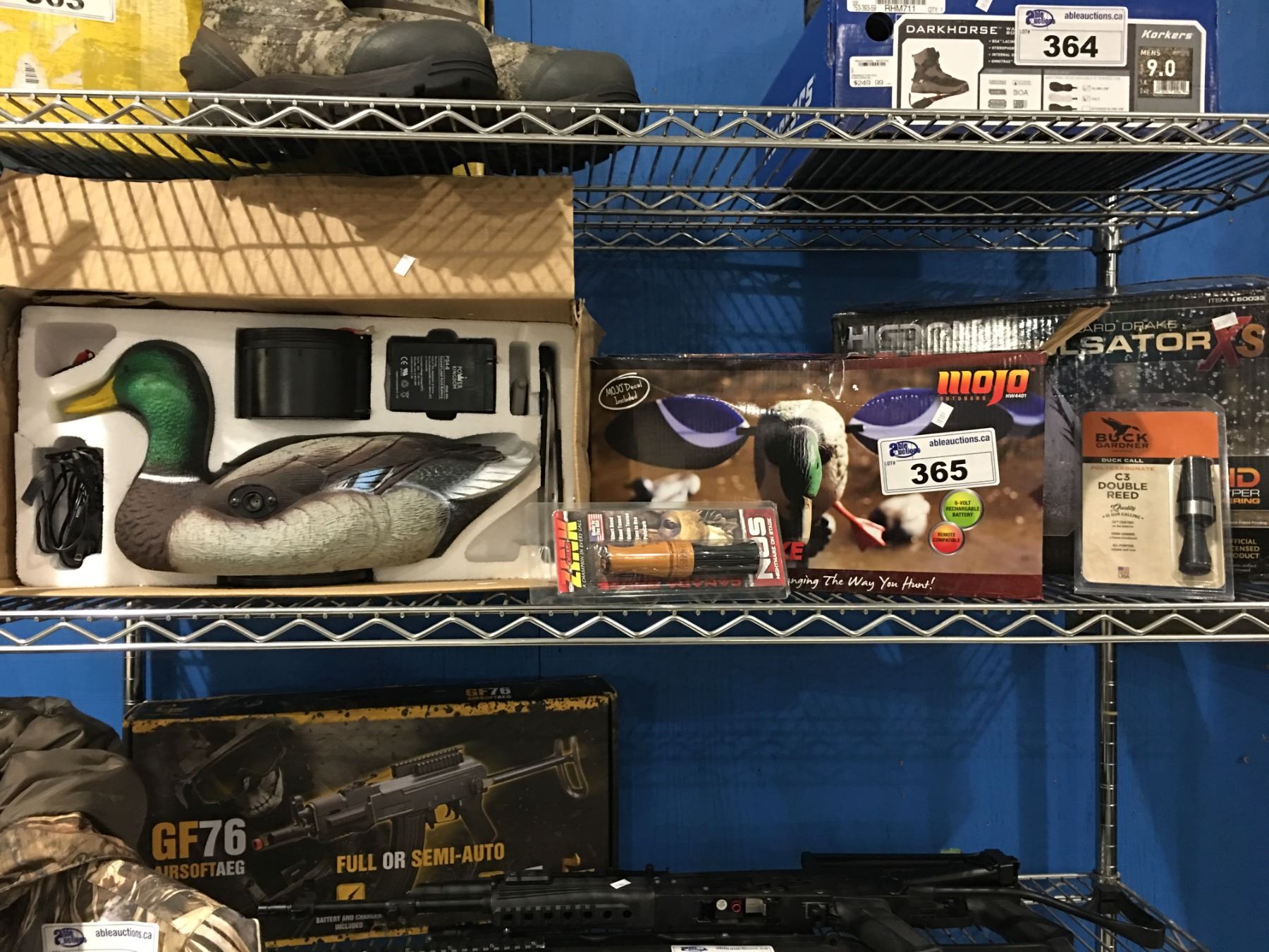 SHELF LOT OF DUCK HUNTING DECOYS & DUCK CALLS