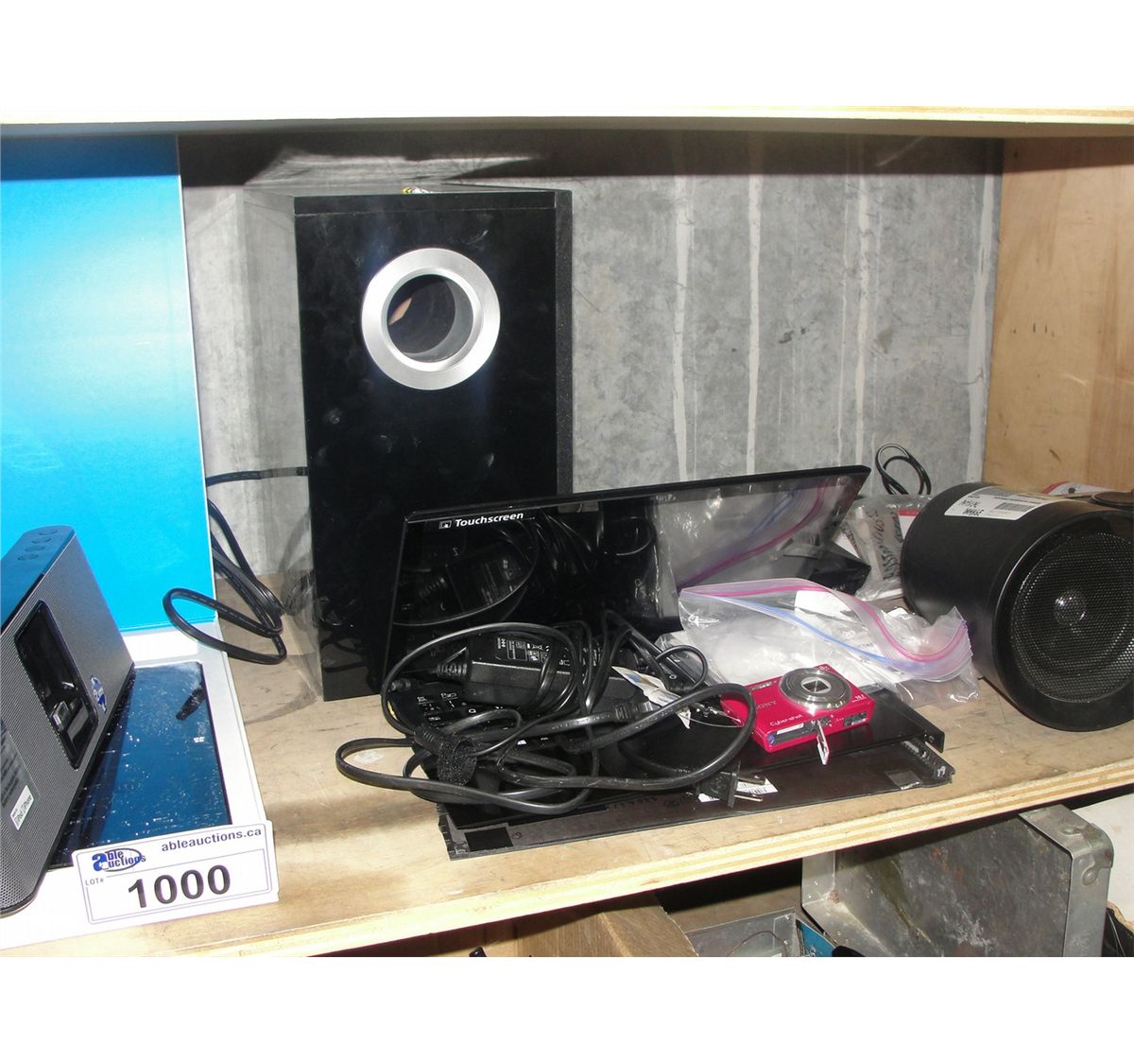 SHELF LOT OF ELECTRONICS; LAPTOP PARTS, SPEAKERS, TABLETS ETC