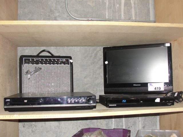 SHELF LOT OF ELECTRONICS; MONITER, FENDER GUITAR AMP, JVC DVD PLAYER AND MAGNAVOX BLURAY DISC PLAYER