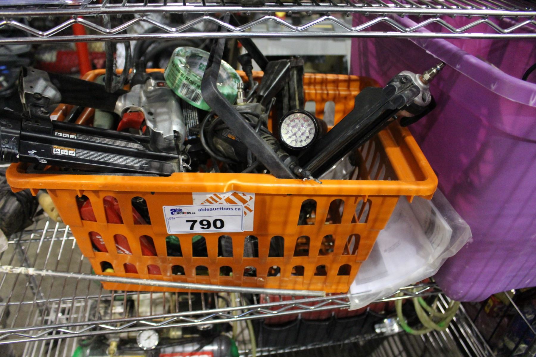 SHELF LOT OF FLASHLIGHTS, ELECTRONICS, TAPE GUNS, BRAD NAILER AND MORE