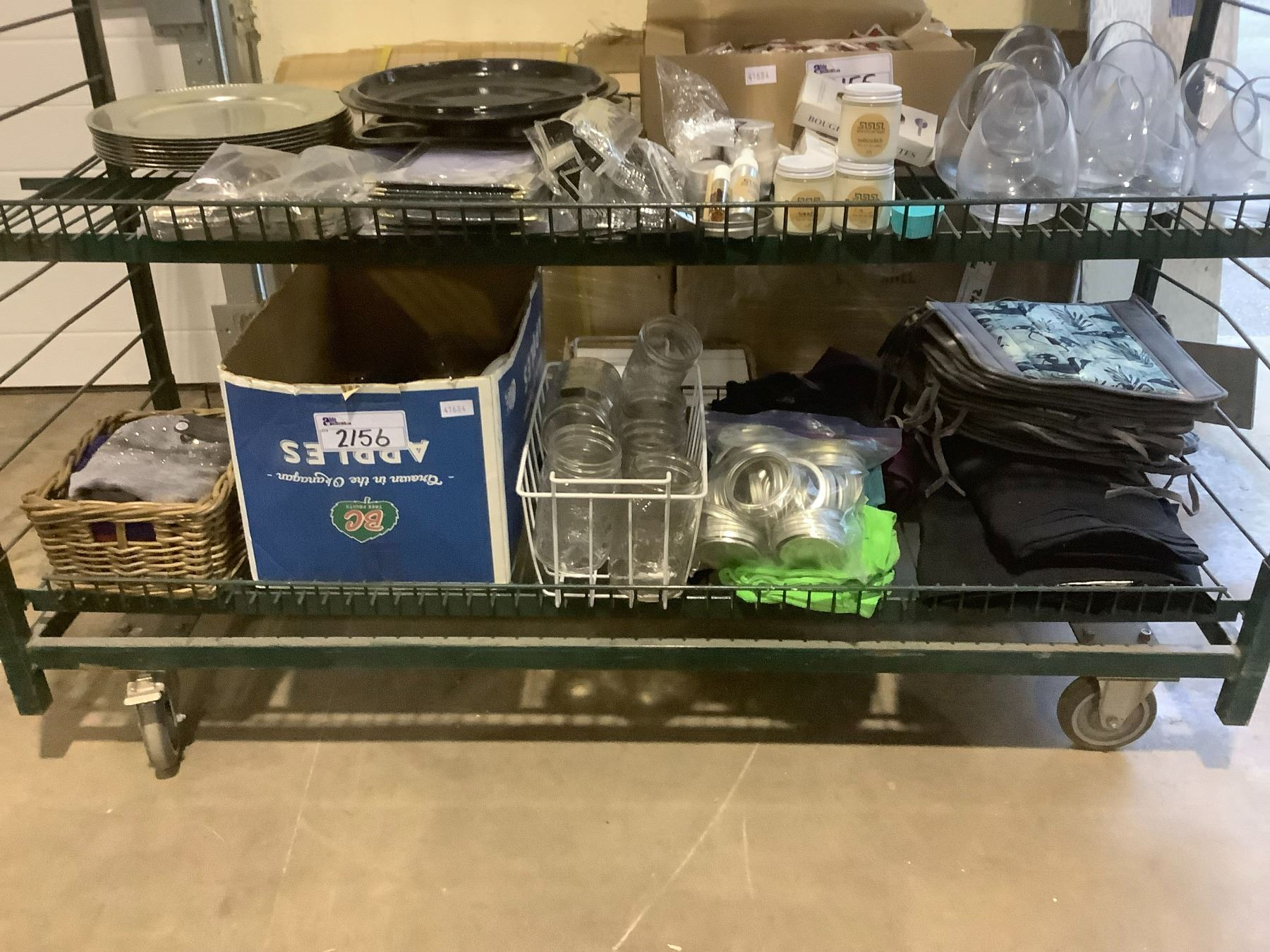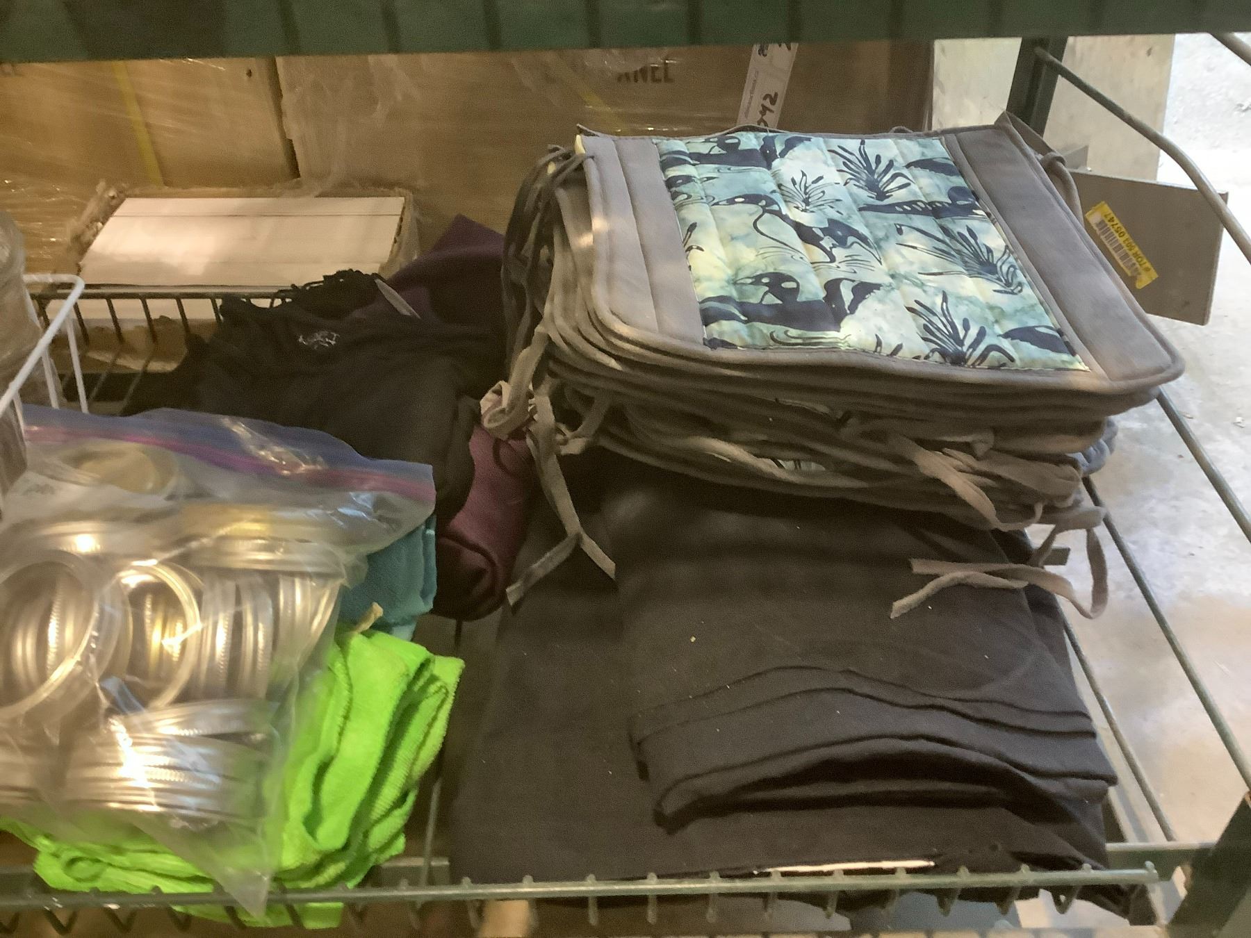SHELF LOT OF GLASSWARE, PADS, RAGS, MASON JARS, AND MORE
