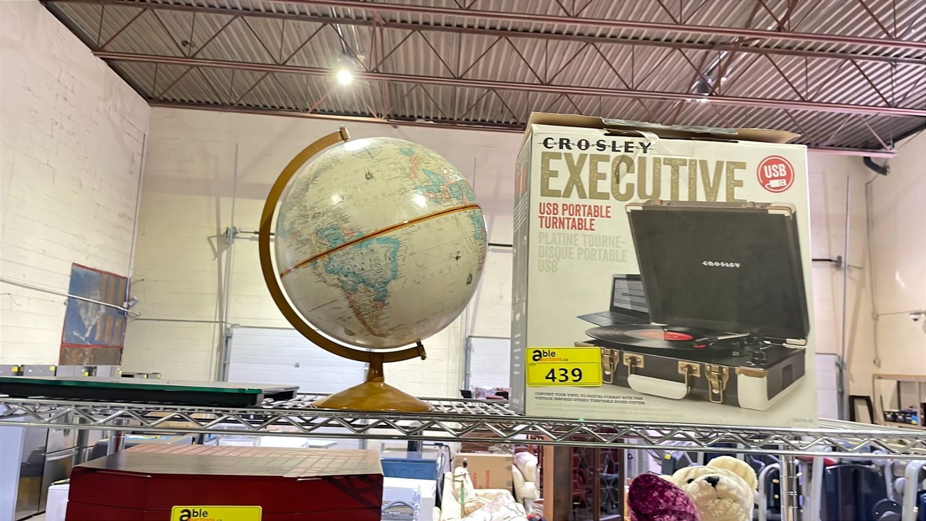 SHELF LOT OF GLOBE, CROSLEY EXECUTIVE USB TURNTABLE AND SCALE