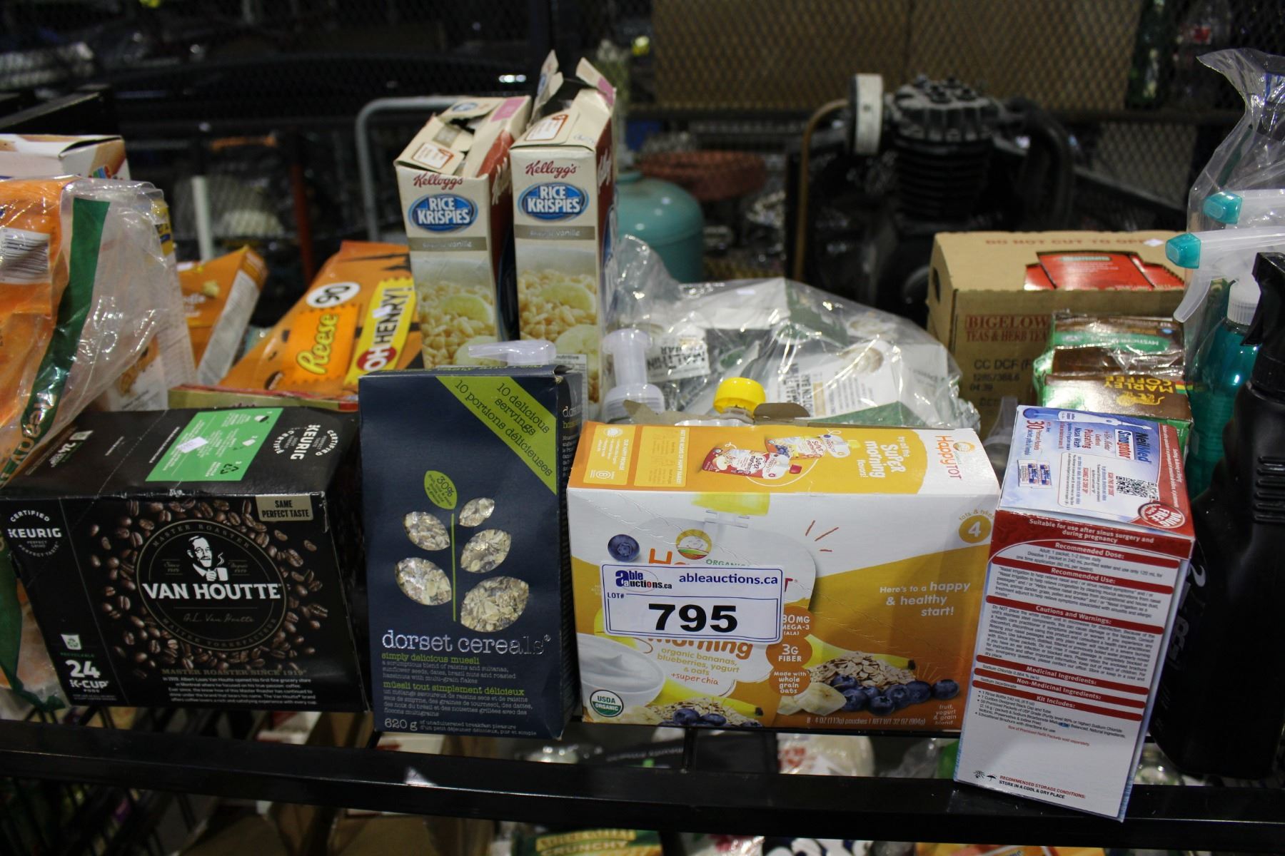 SHELF LOT OF HALLOWEEN CANDY, CEREAL, SEASONINGS, CLEANING SUPPLIES AND MORE