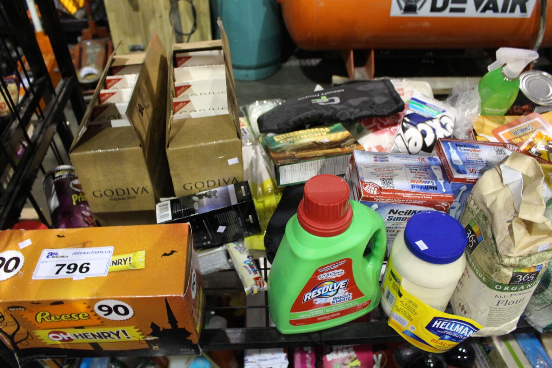 SHELF LOT OF HALLOWEEN CANDY, SEASONINGS, LAUNDRY DETERGENT, CHOCOLATE AND MORE