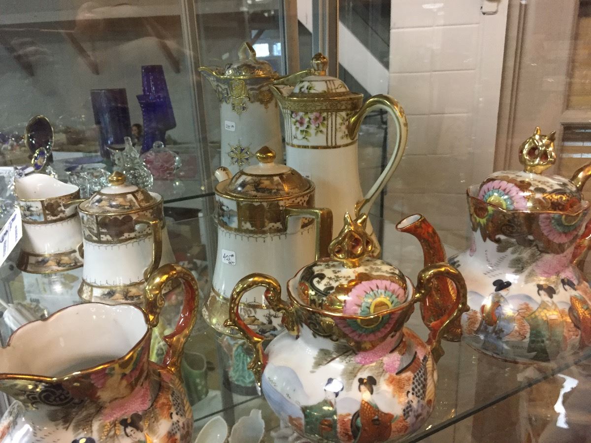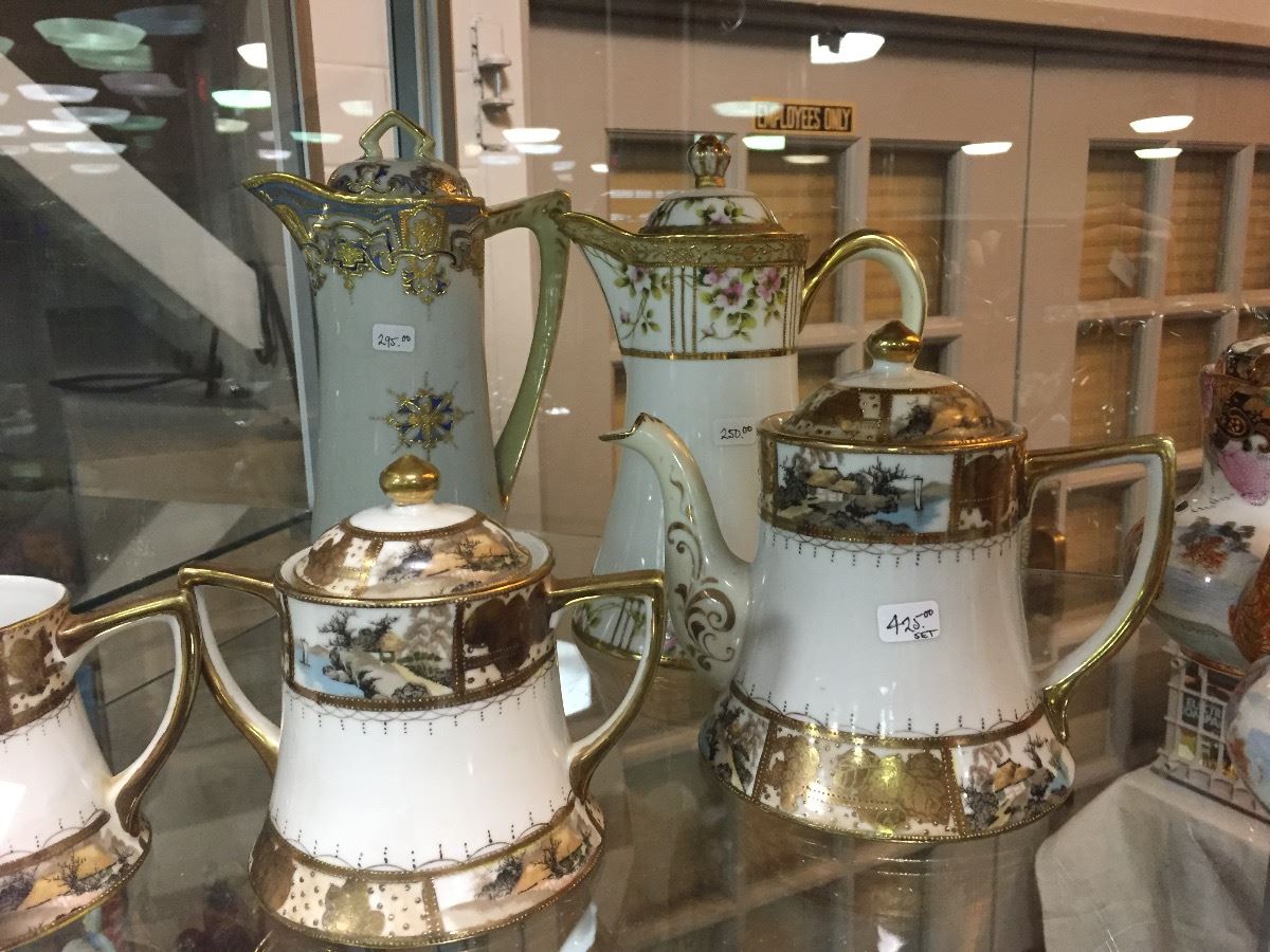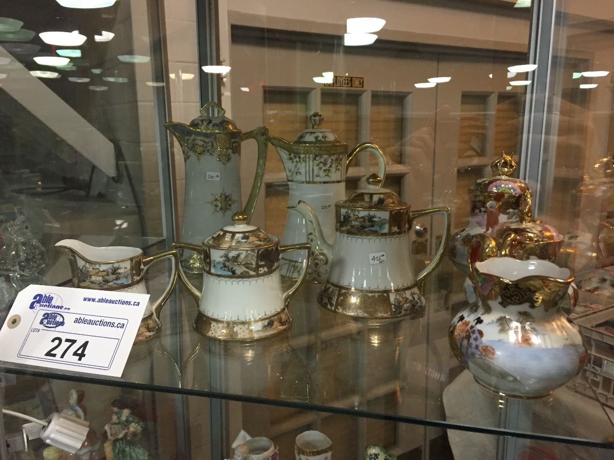 SHELF LOT OF HAND PAINTED PORCELAIN TEA AND COFFEE SETS, NIPPON, SHOFU, ETC.