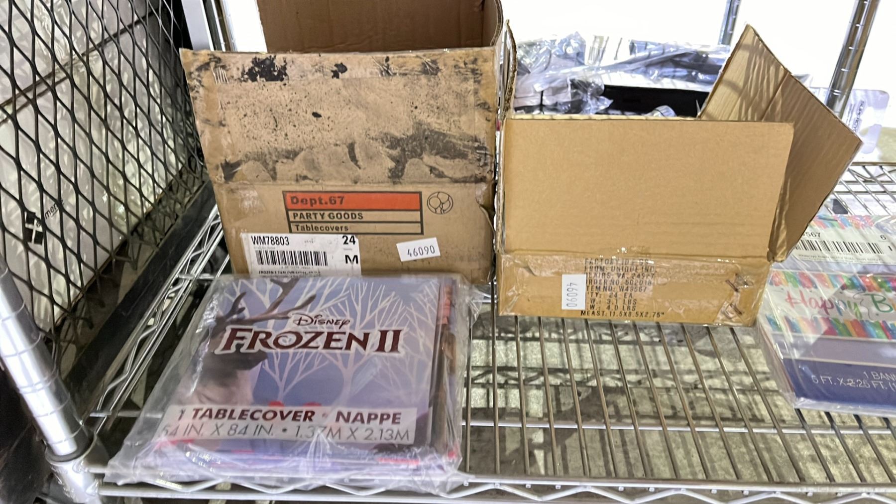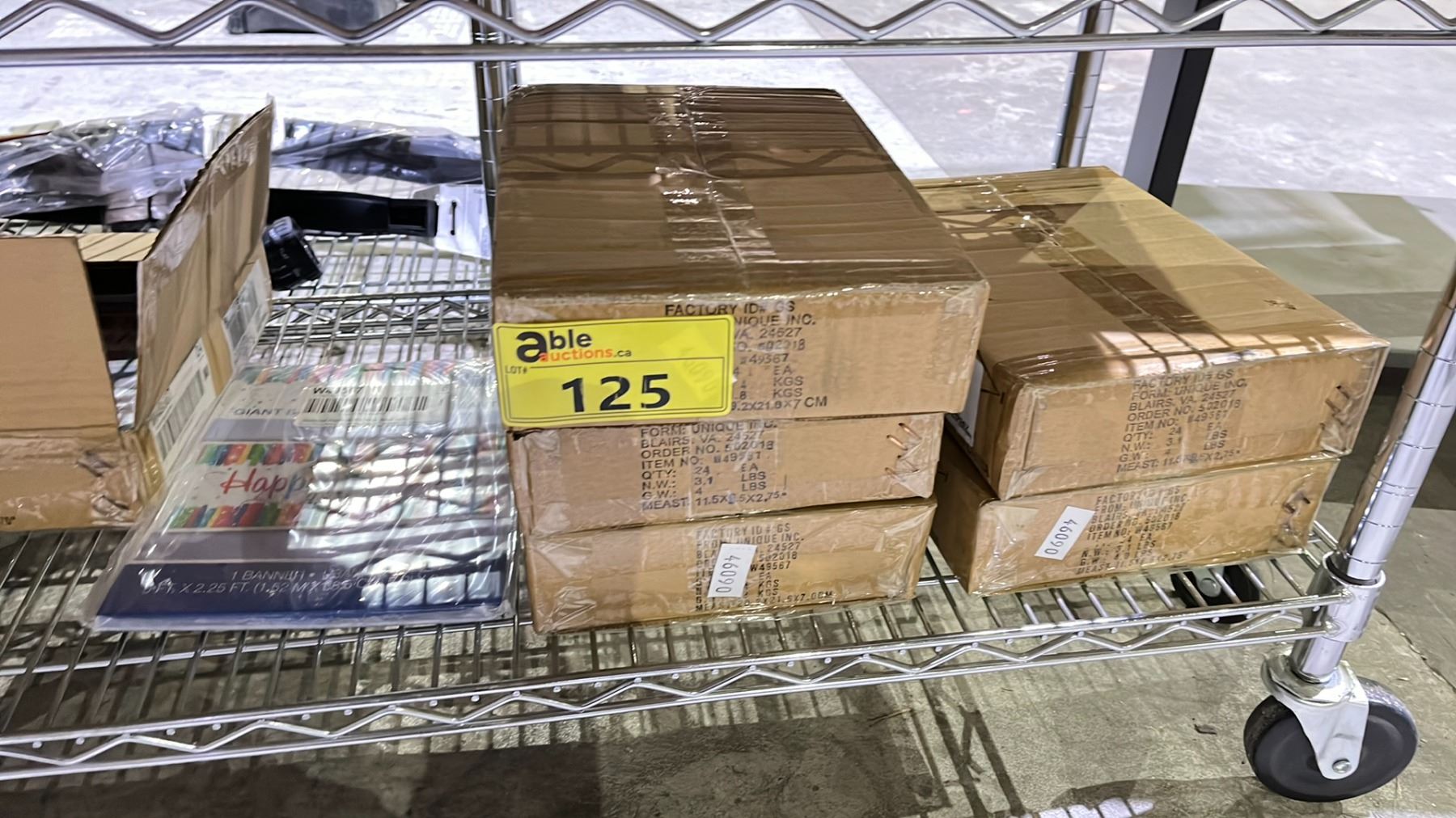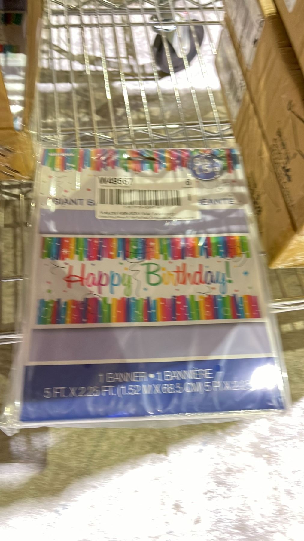 SHELF LOT OF HAPPY BIRTHDAY BANNERS, TABLE COVERS AND MORE