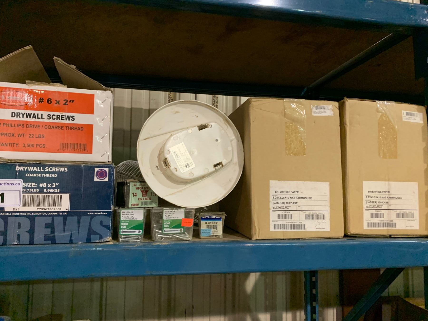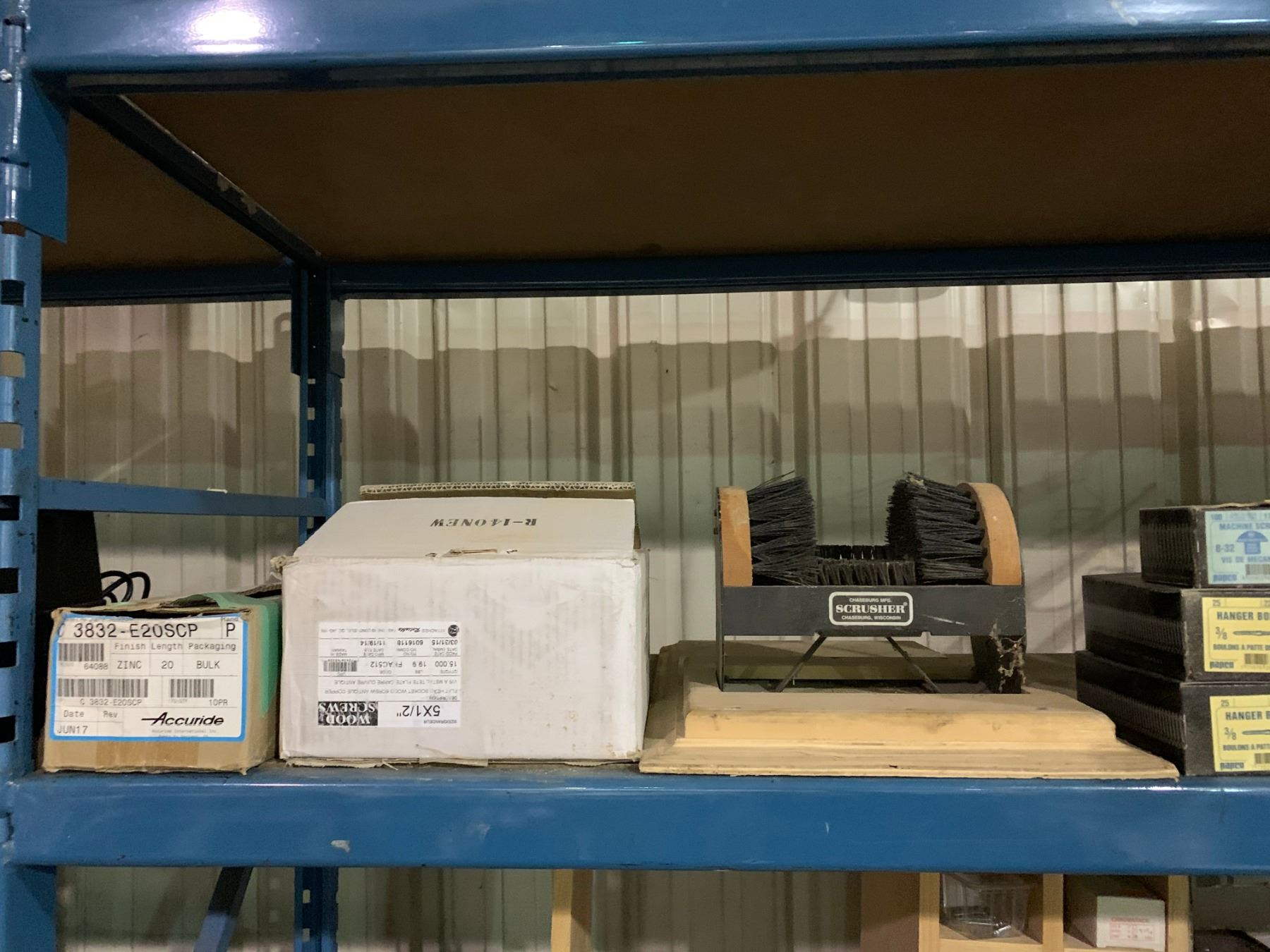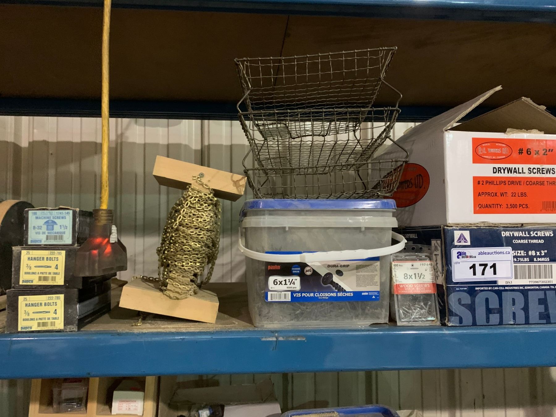 SHELF LOT OF HARDWARE, DRYWALL SCREWS, CHAIN & SCRUSHER