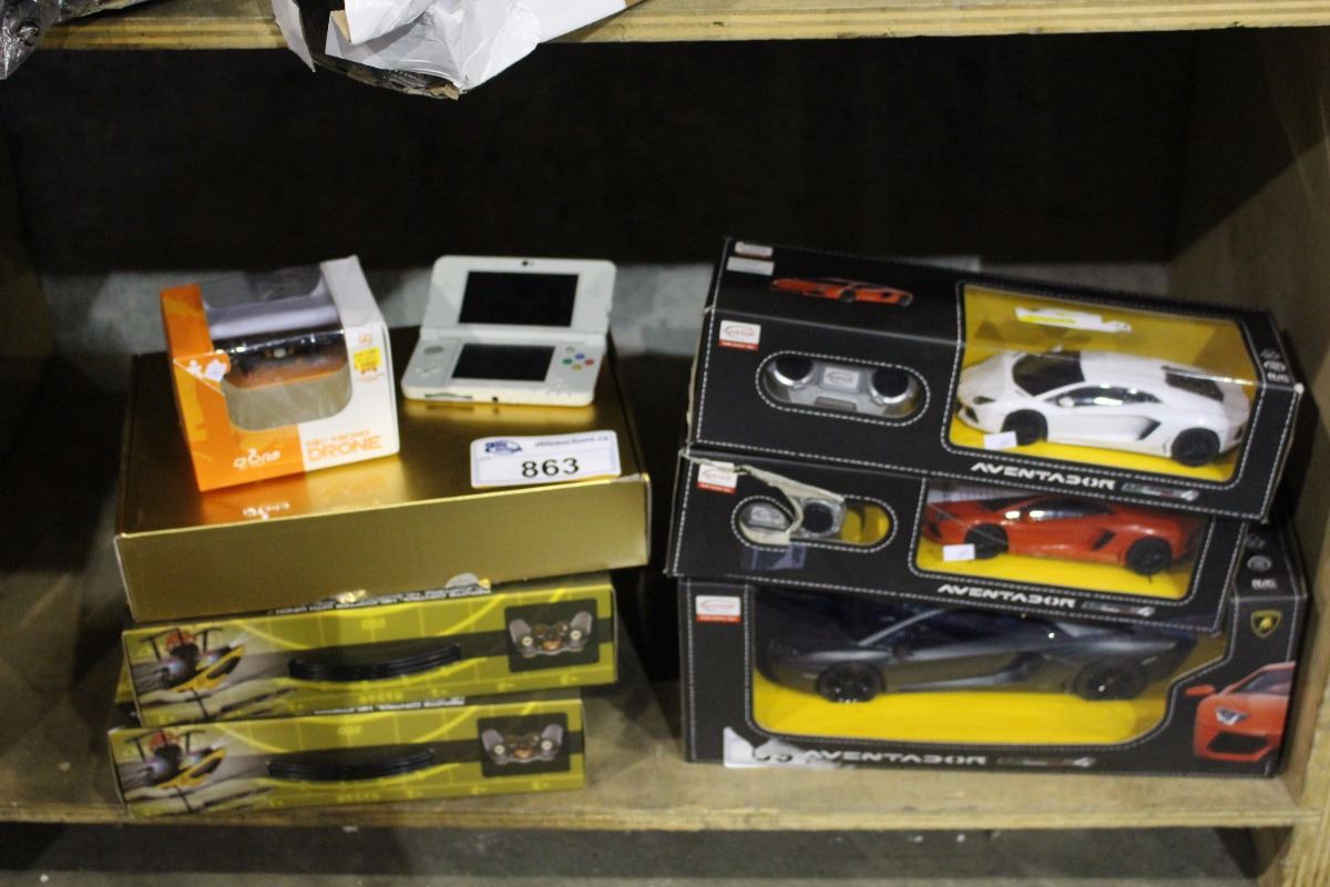 SHELF LOT OF HELICOPTORS AND RODIO CONTROLLED CARS
