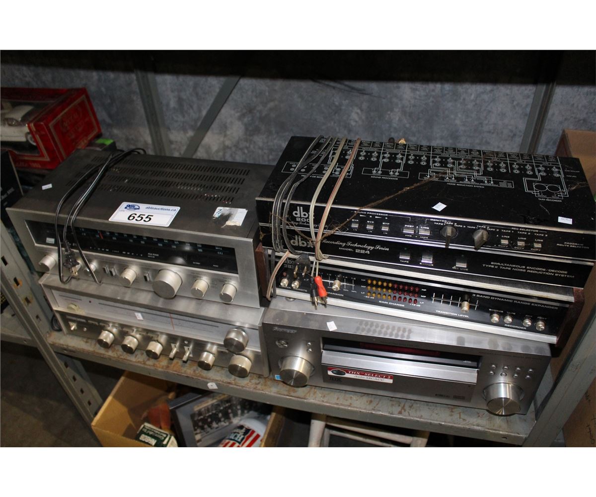 SHELF LOT OF HOME AUDIO ELECTRONICS