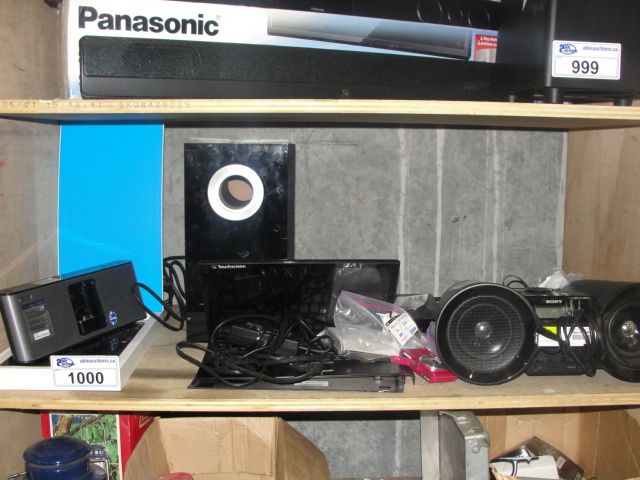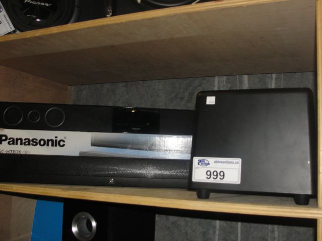 SHELF LOT OF HOME AUDIO SPEAKERS; PANASONIC, BOSTON, TOSHIBA SOUND BAR, ETC