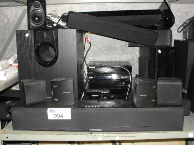 SHELF LOT OF HOME ELECTRONICS; BLURAY PLAYER, SPEAKERS, ETC