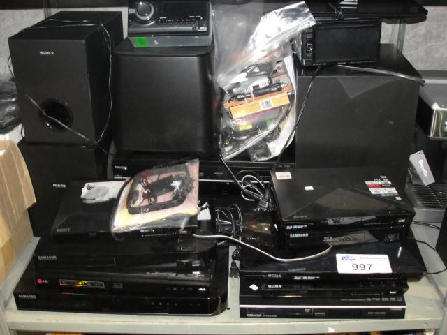 SHELF LOT OF HOME ELECTRONICS; BLURAY PLAYER, SPEAKERS, ETC