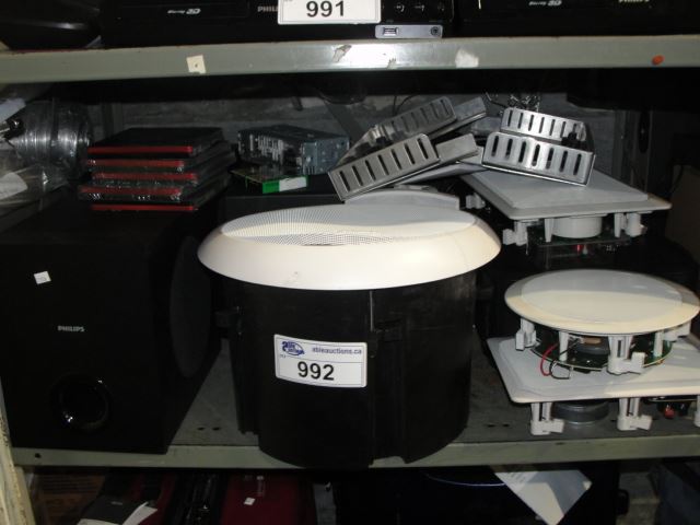 SHELF LOT OF HOME ELECTRONICS; POLK AUDIO SPEAKERS, DVDS ETC
