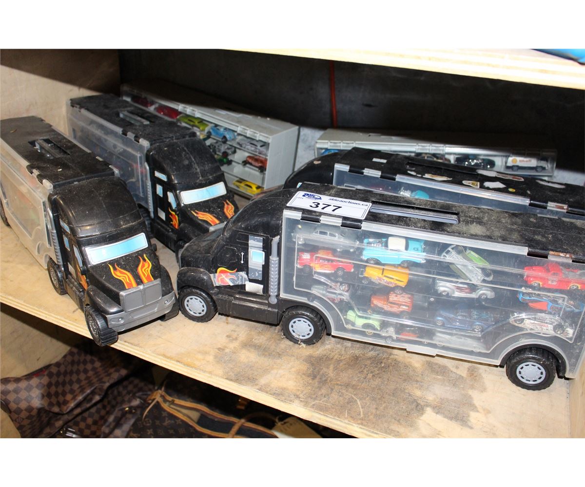 SHELF LOT OF HOTWHEELS COLLECTORS STORAGE TRUCKS AND HOTWHEELS CARS