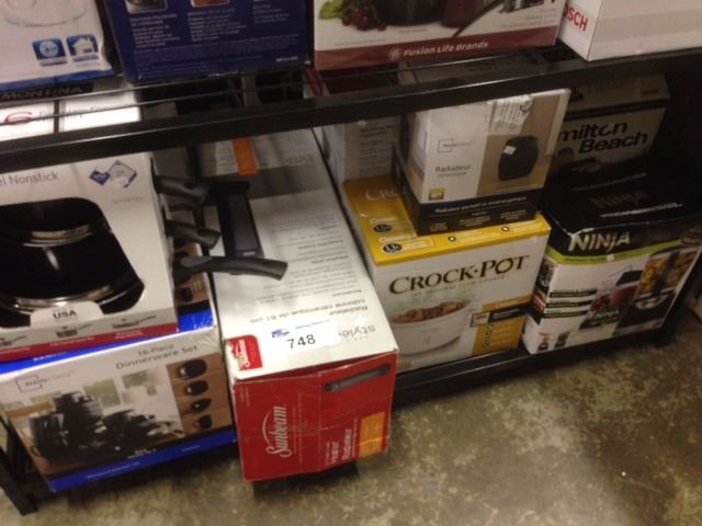 SHELF LOT OF HOUSEHOLD ITEMS INCLUDING CROCK POT, NINJA BLENDER, RADIATOR, ETC.