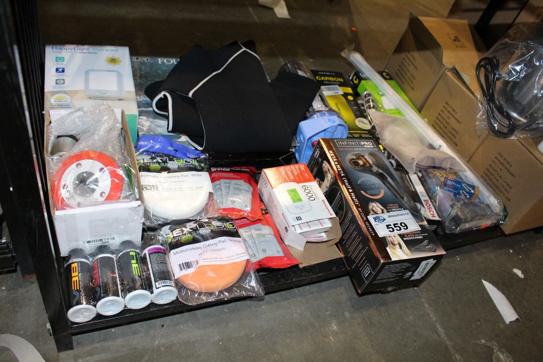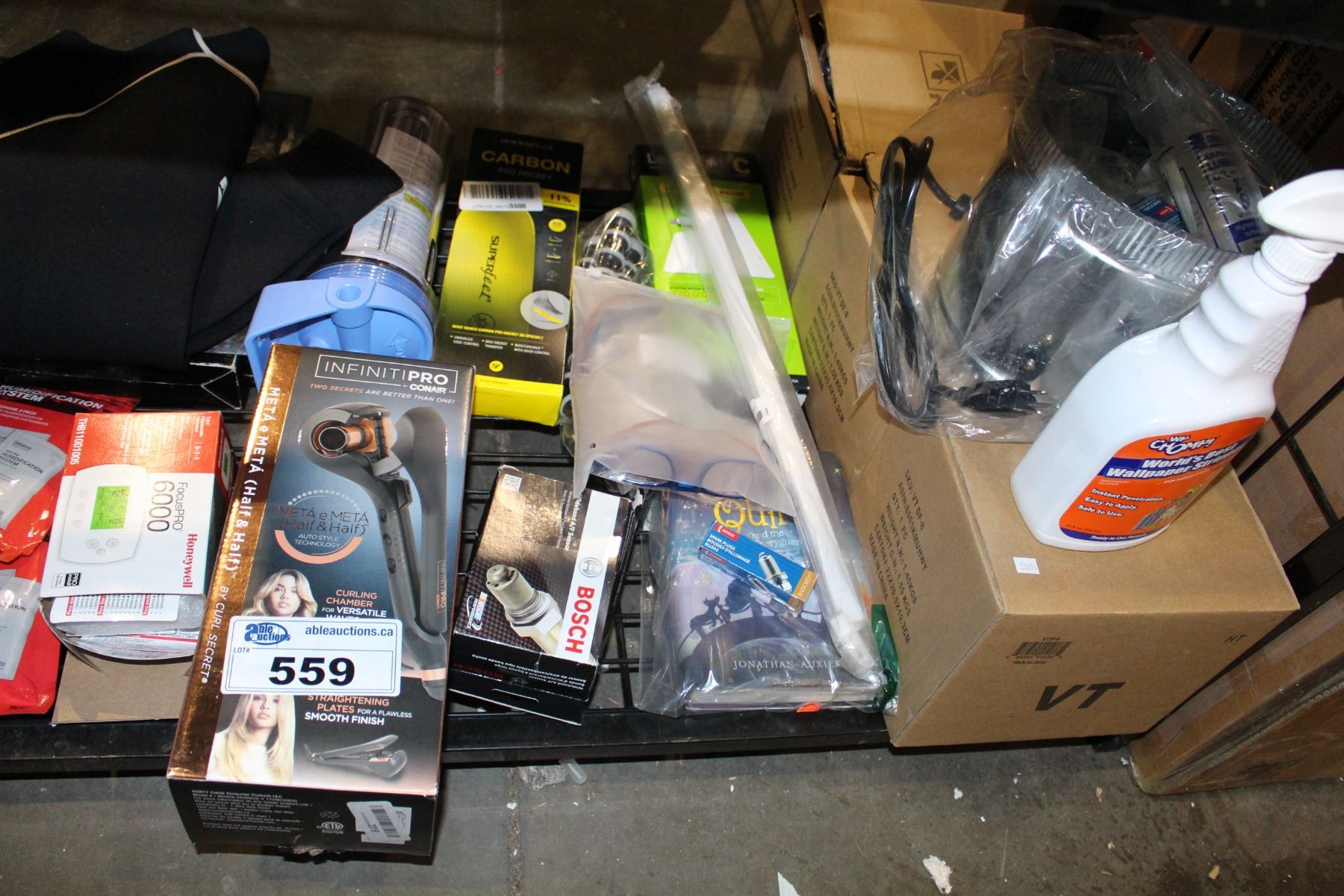 SHELF LOT OF INDOOR OUTDOOR THERMOMETERS, HAIR TOOLS, AND MORE