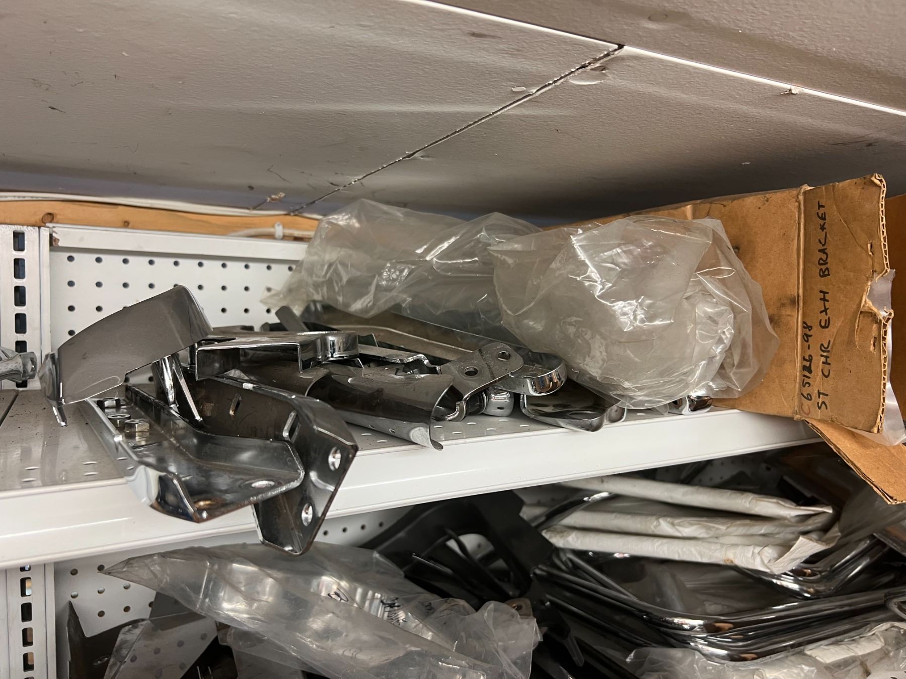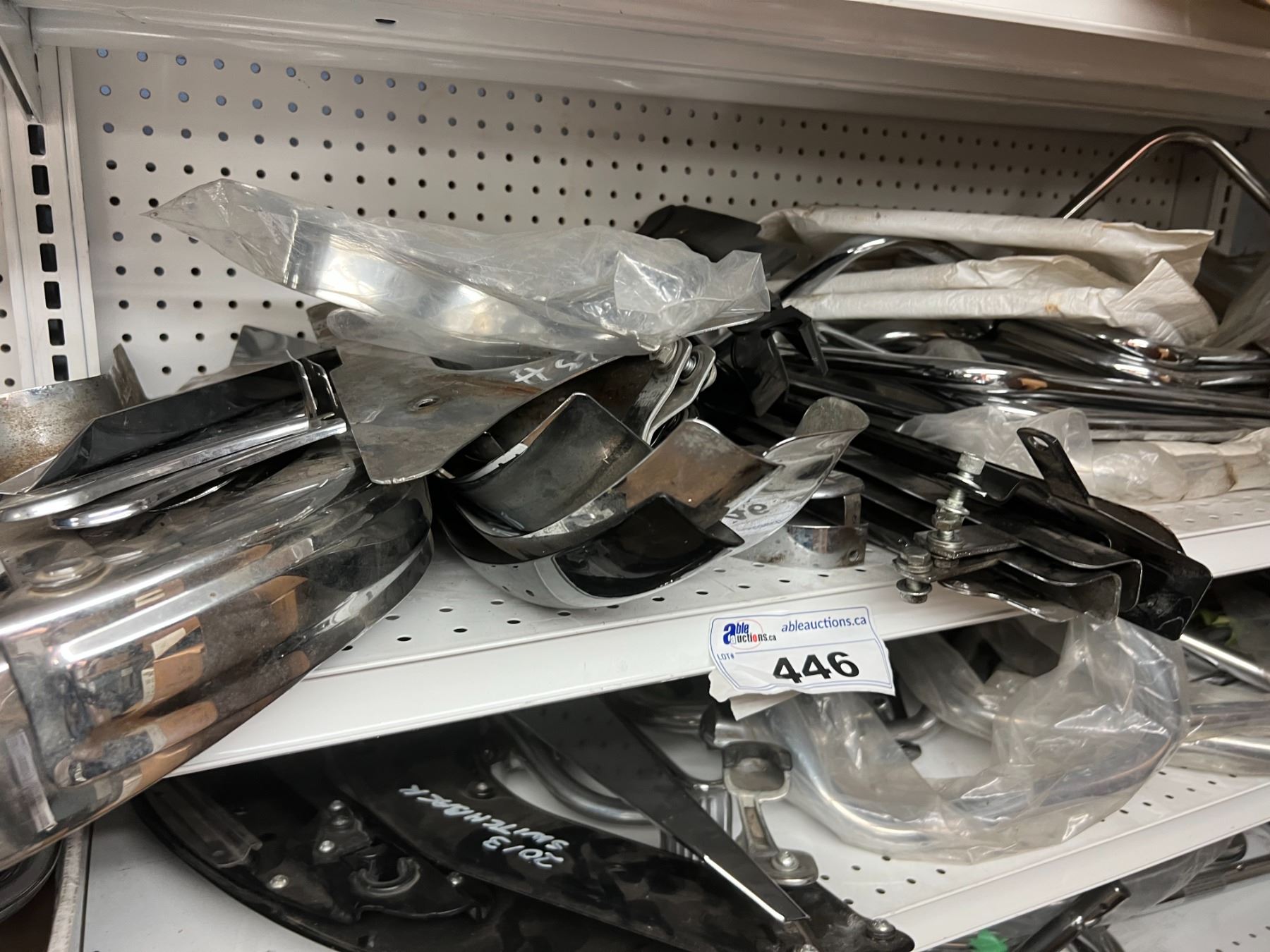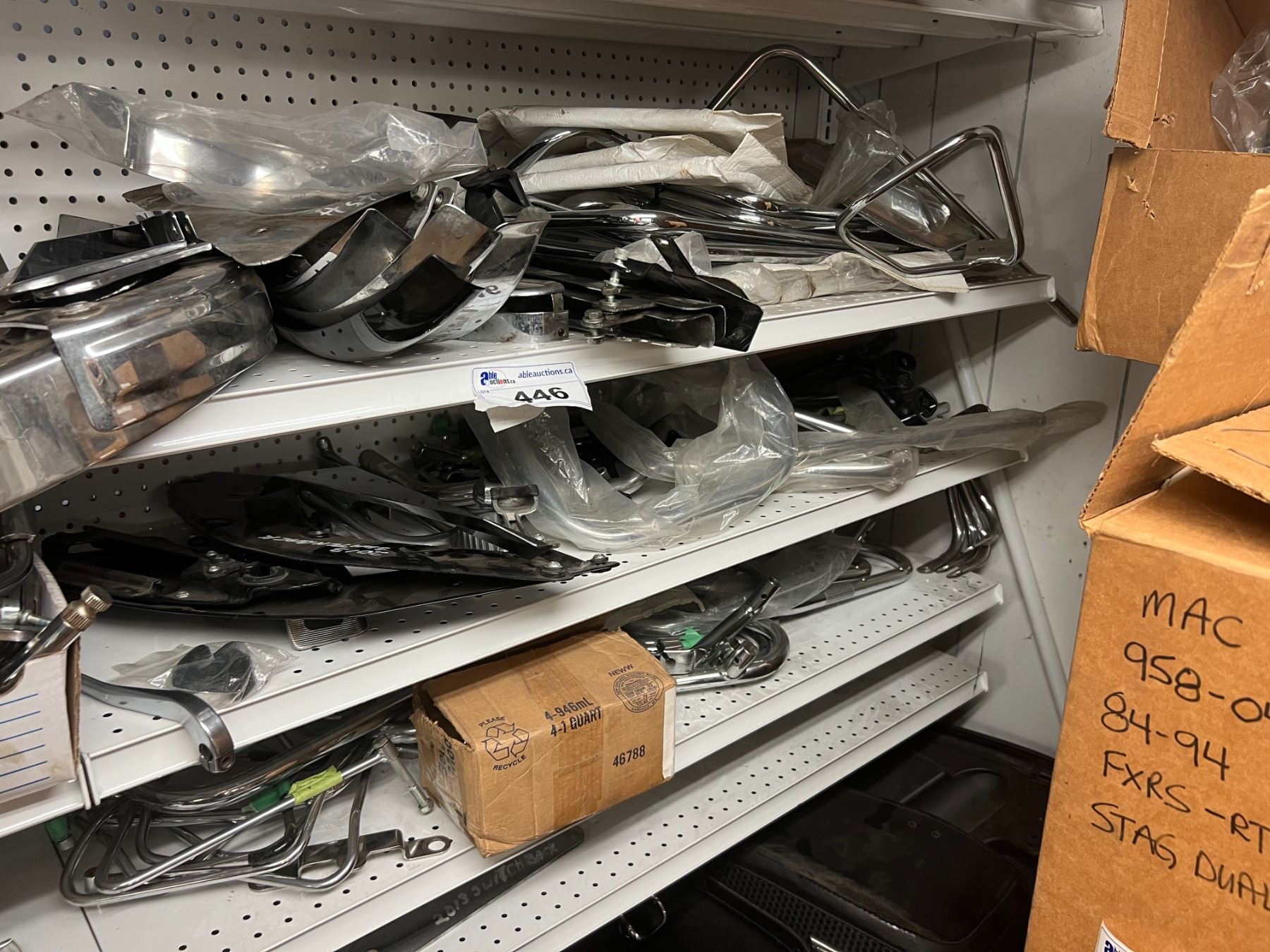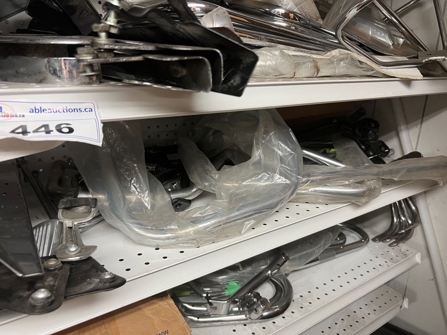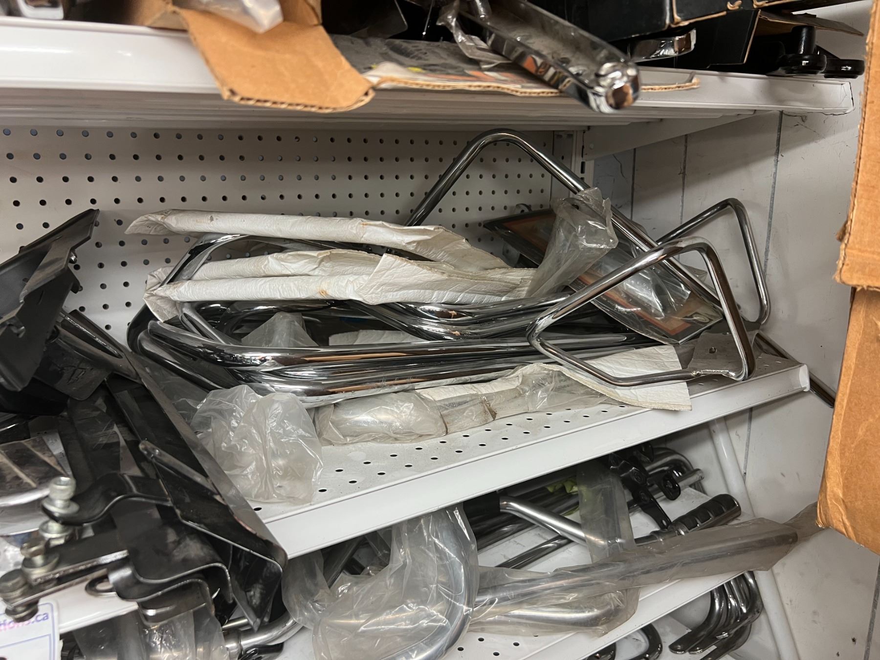SHELF LOT OF INVENTORY - HARLEY-DAVIDSON, CHAIN GUARDS, GRAB BARS, WINDSHIELD TRIM, HANDLE BARS, CHROME BRACKETS, SIDE BARS, BACK RESTS & USED SADDLE BAGS ETC.