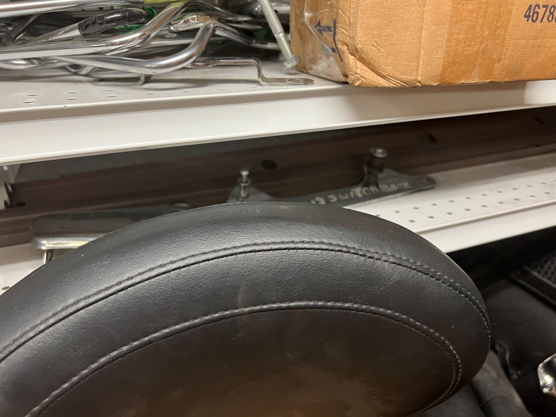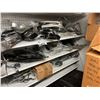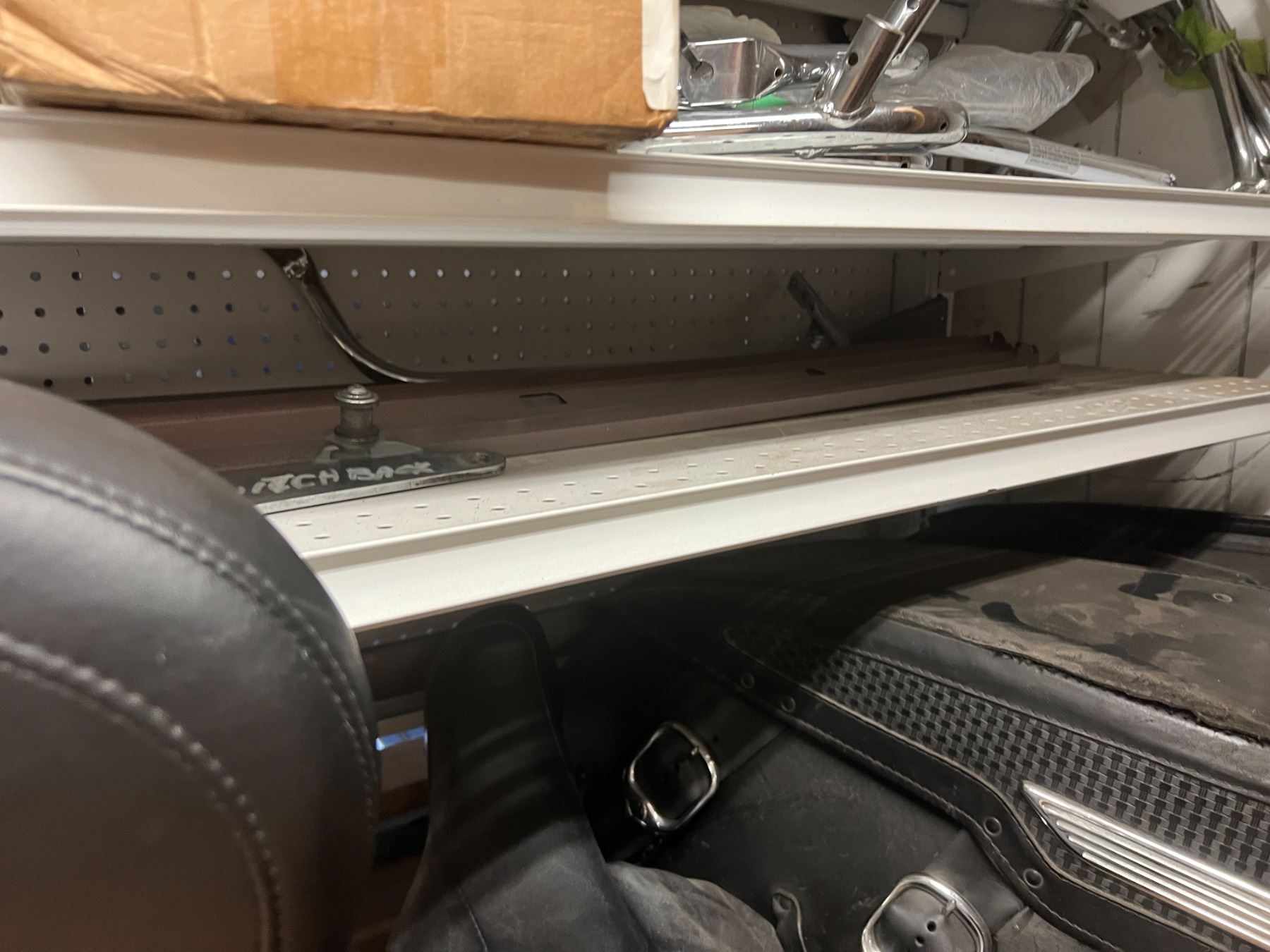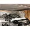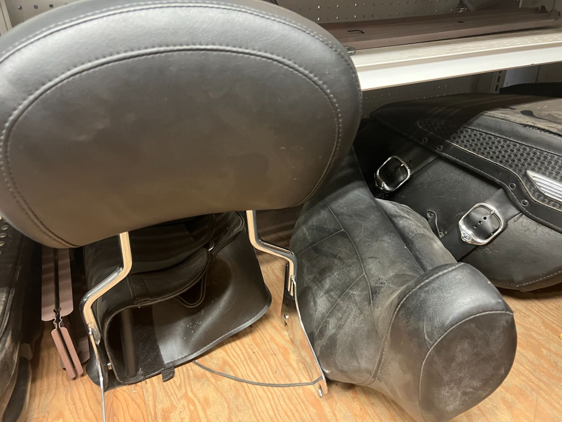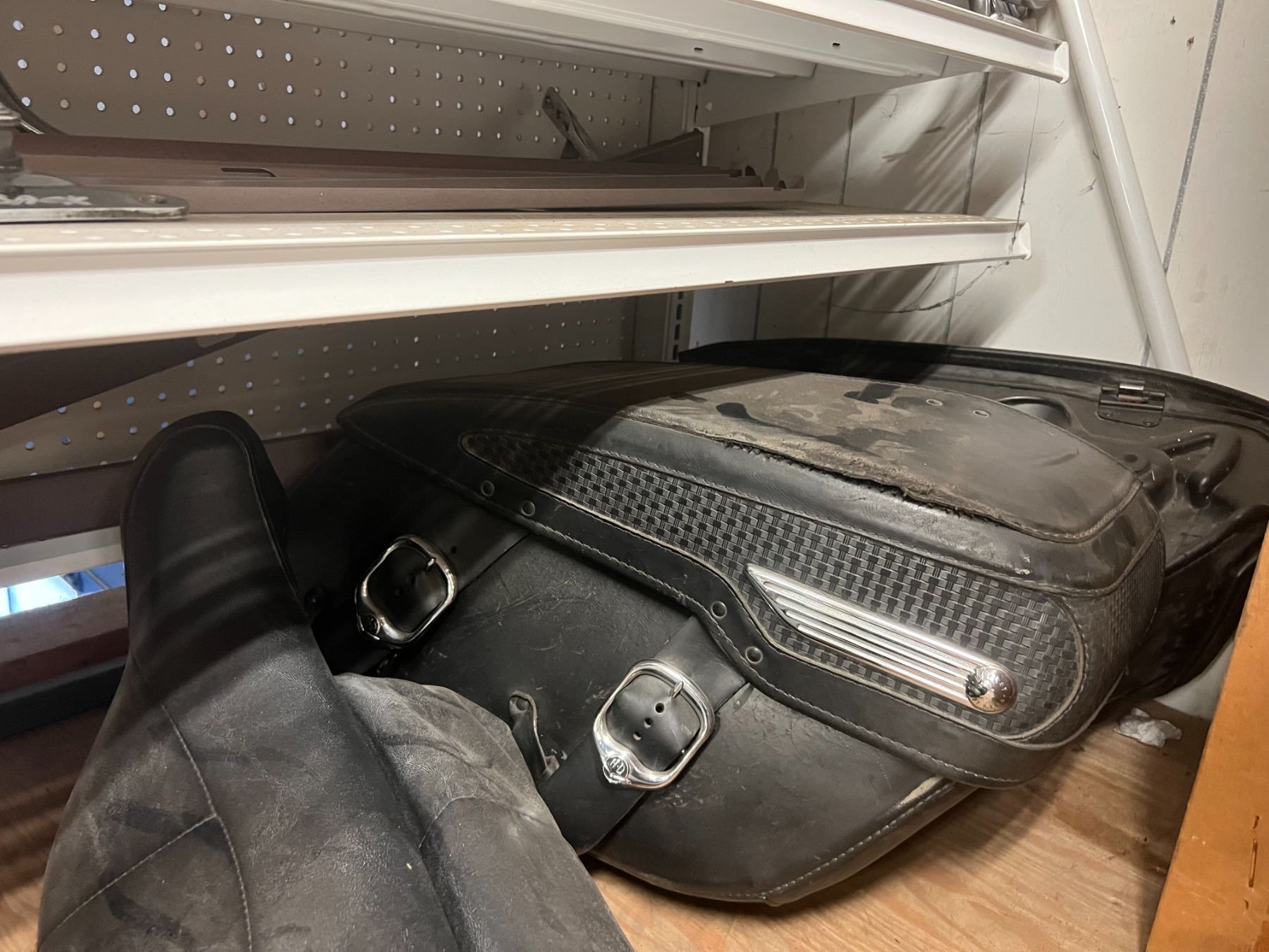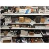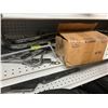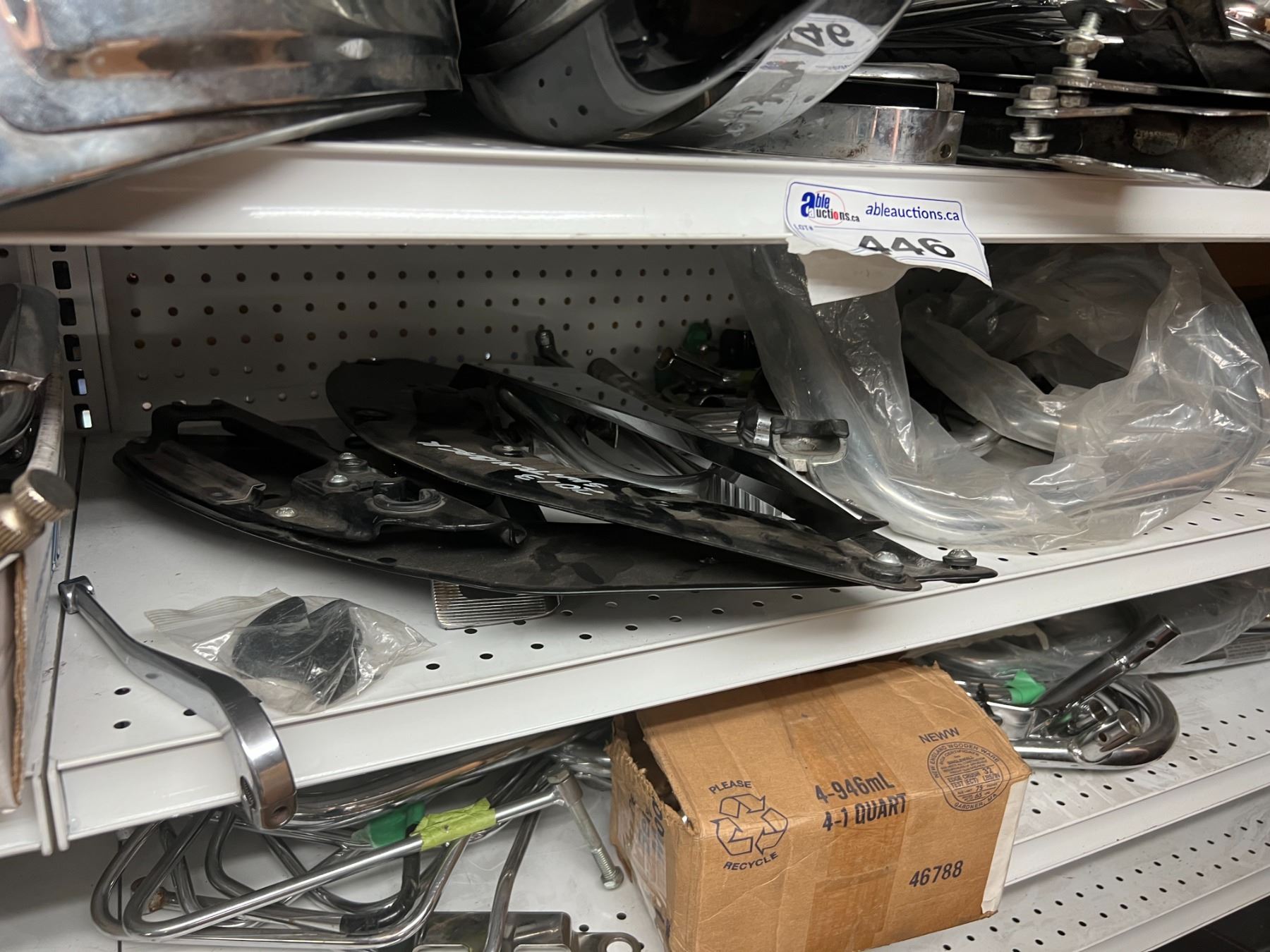 SHELF LOT OF INVENTORY - HARLEY-DAVIDSON, CHAIN GUARDS, GRAB BARS, WINDSHIELD TRIM, HANDLE BARS, CHROME BRACKETS, SIDE BARS, BACK RESTS & USED SADDLE BAGS ETC.