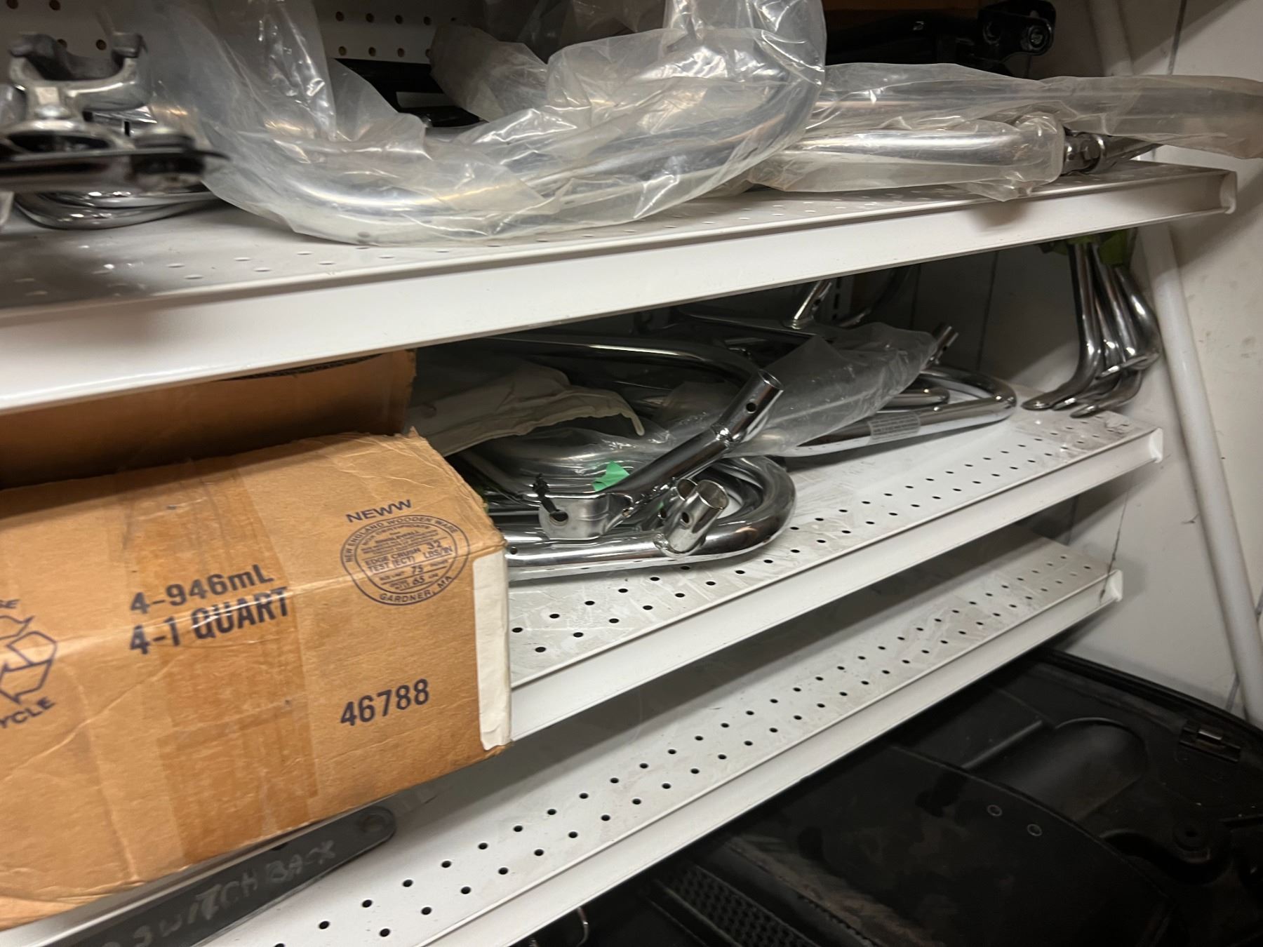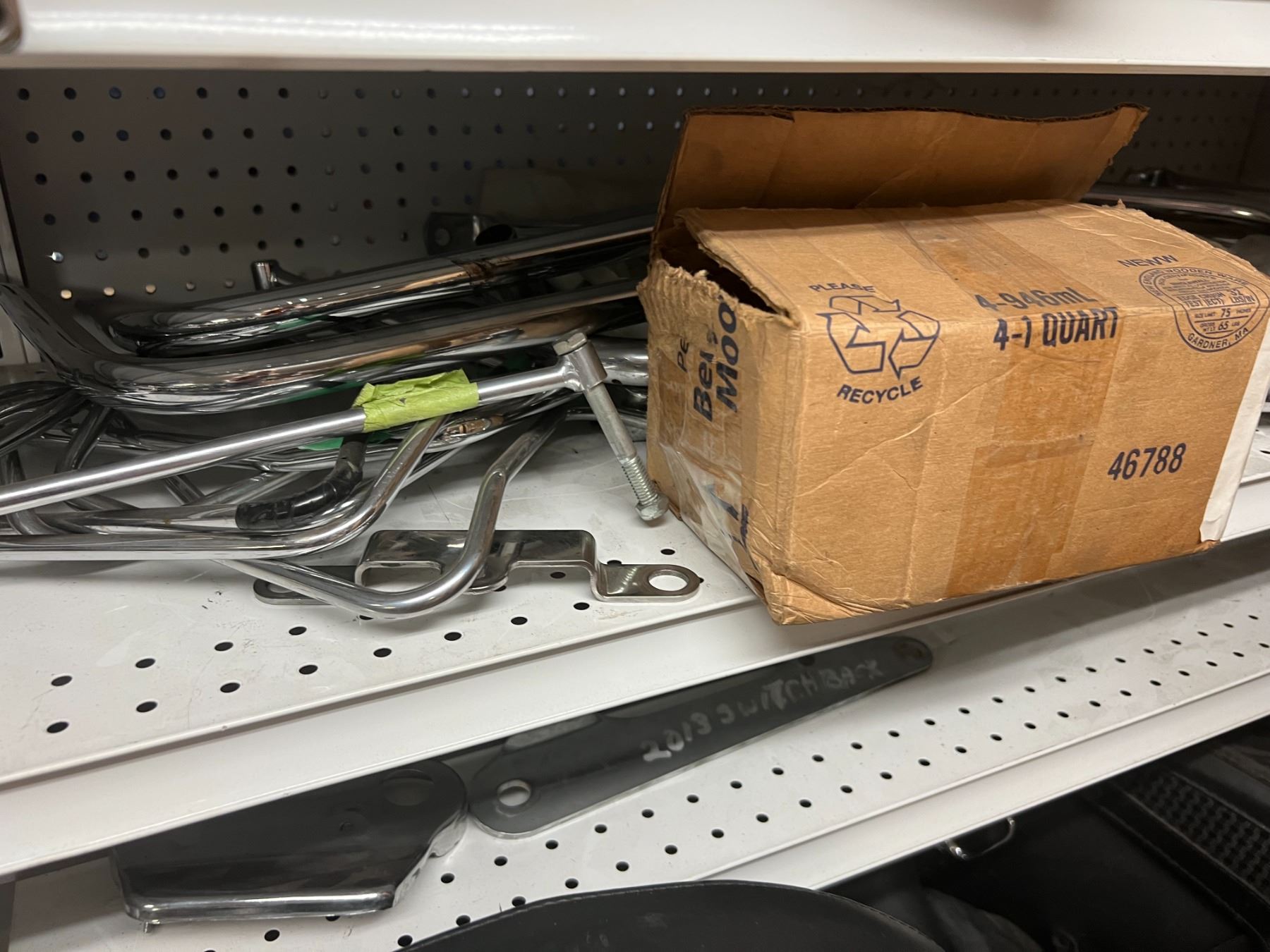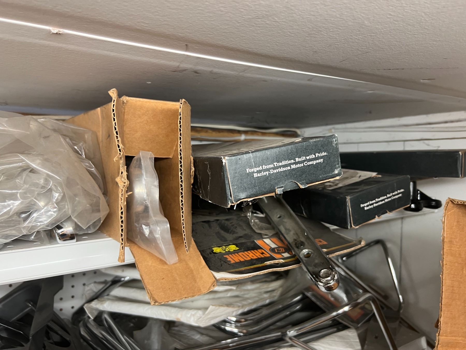 SHELF LOT OF INVENTORY - HARLEY-DAVIDSON, CHAIN GUARDS, GRAB BARS, WINDSHIELD TRIM, HANDLE BARS,