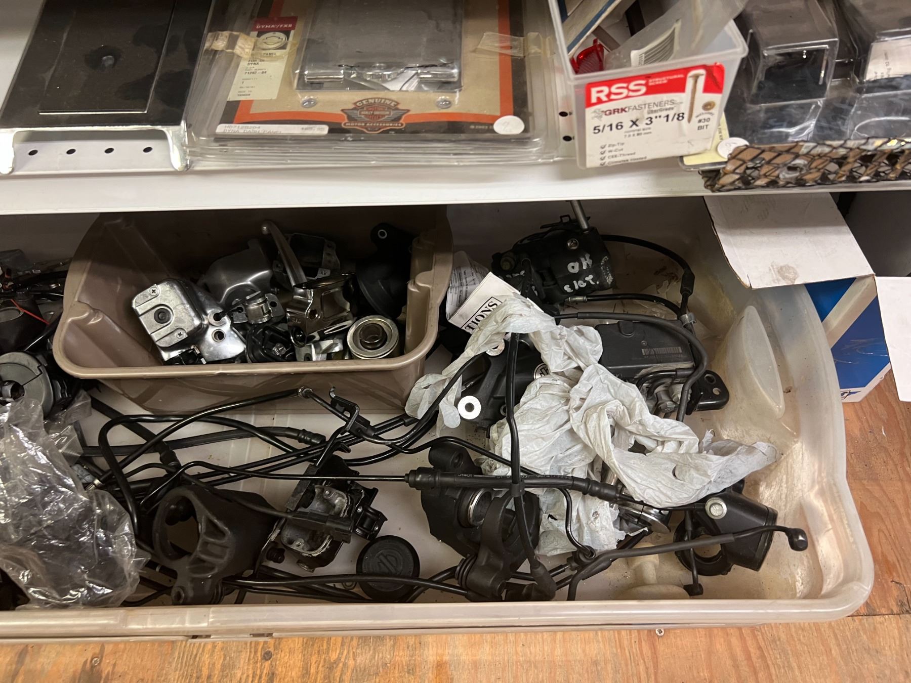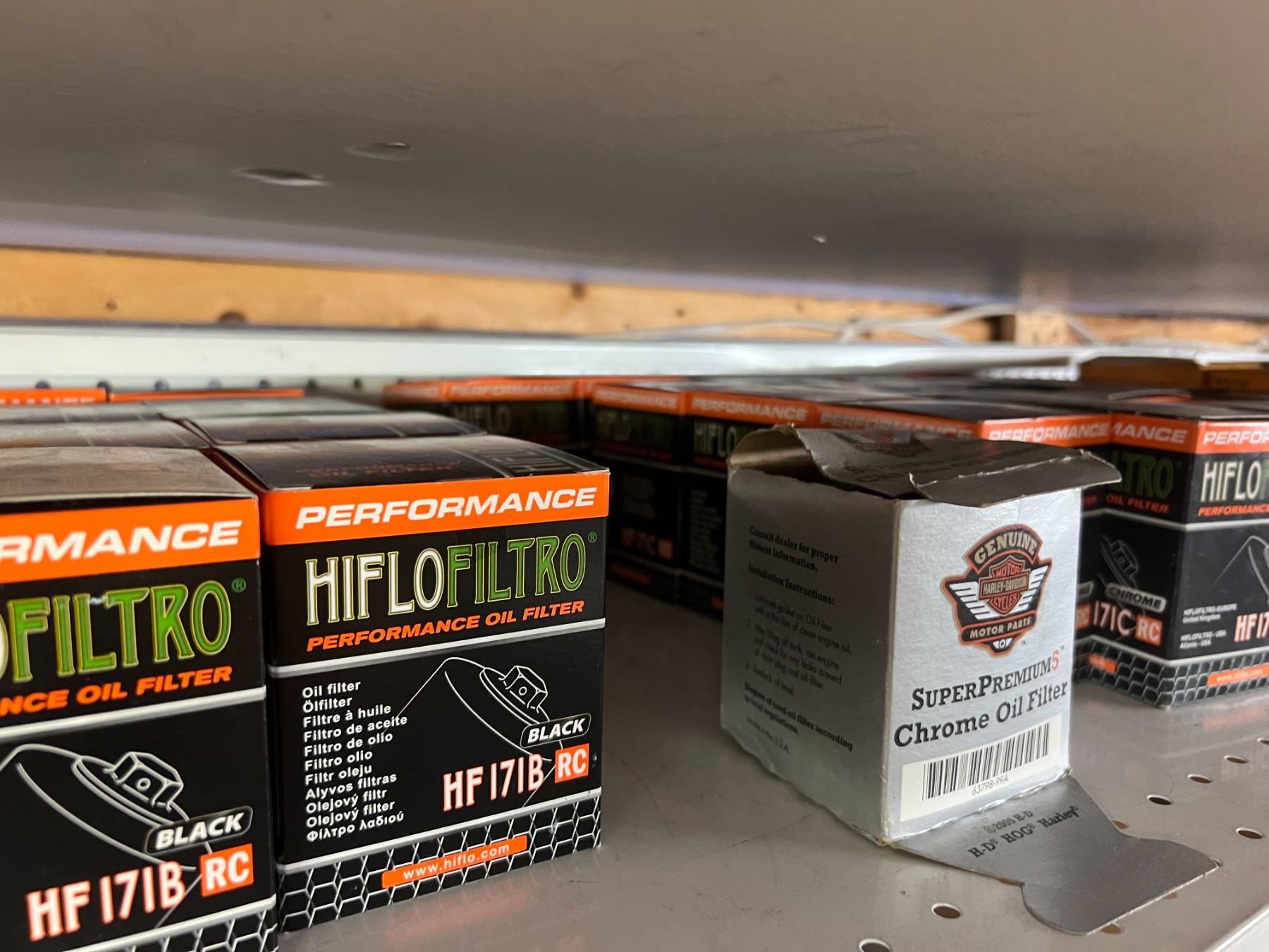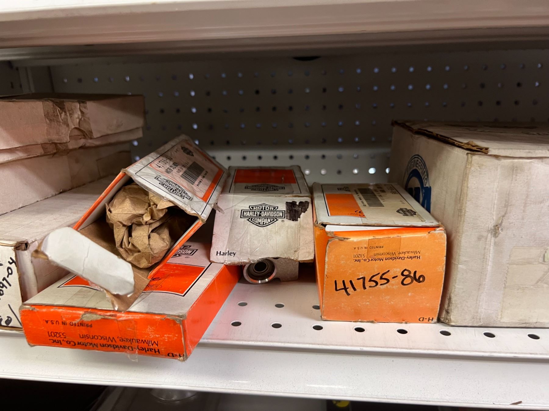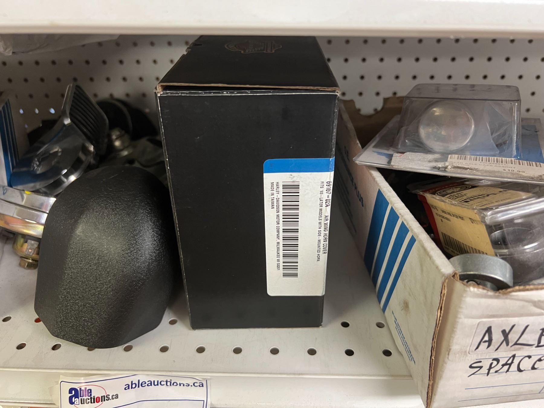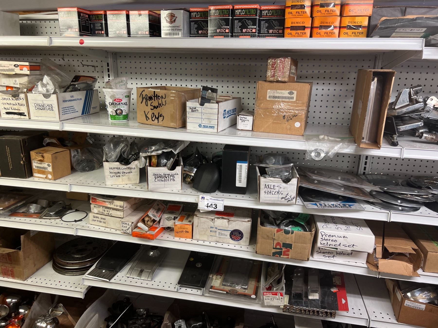 SHELF LOT OF INVENTORY - HARLEY-DAVIDSON HIGH FLOW FILTERS (APPROX 50 PIECES) IGNITION SWITCHES & KEYS, FENDER RAILS, HORNS, BRAKE SHOES, STEREO HELMET SETS, BRAKE CALIPERS ETC